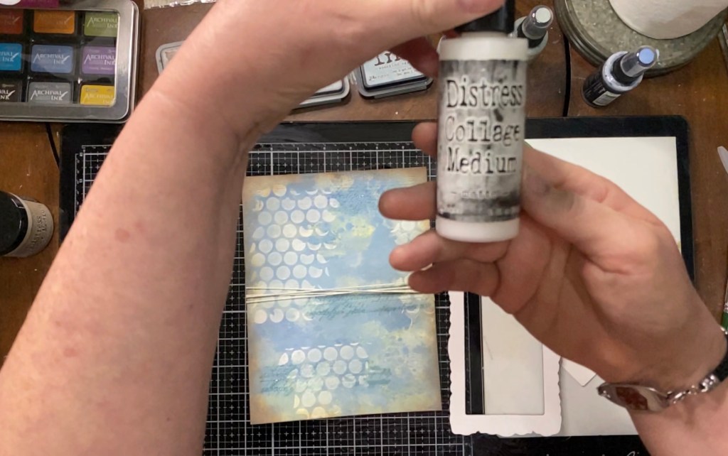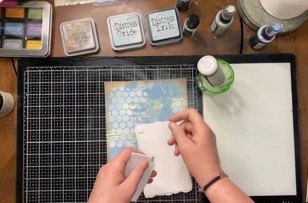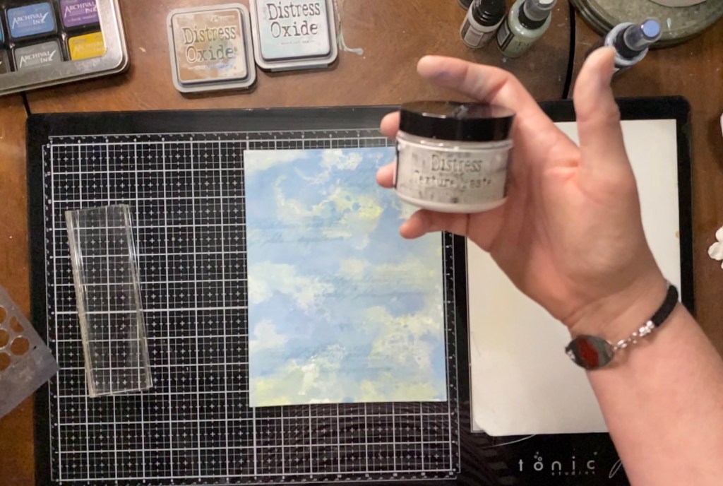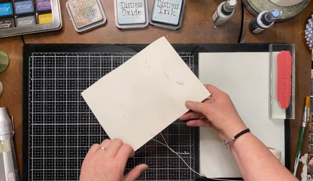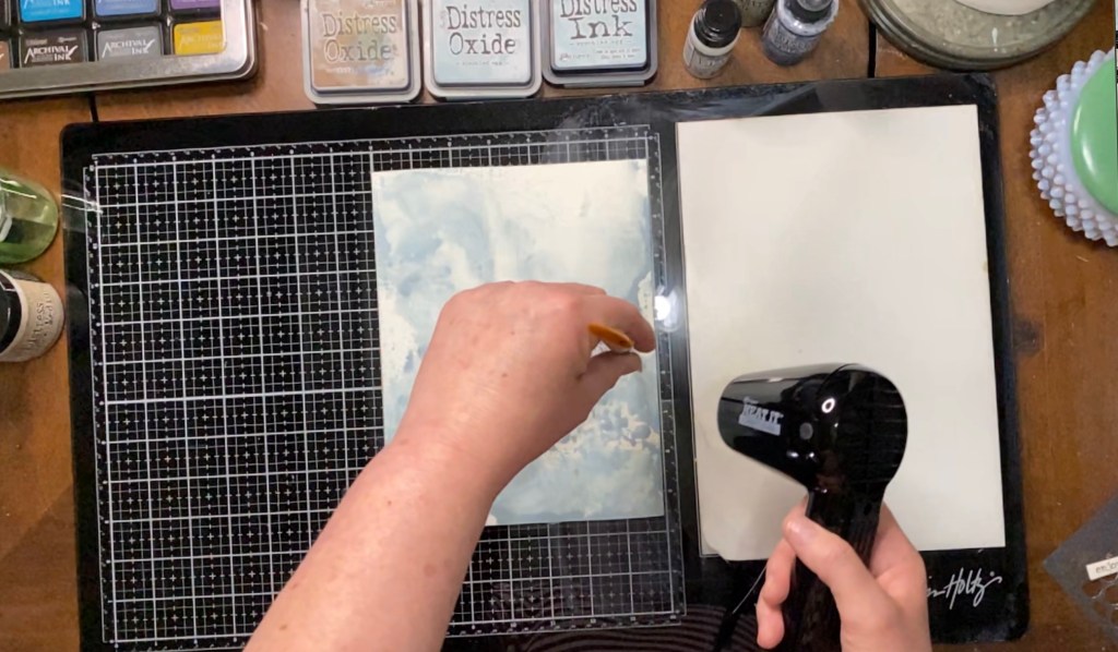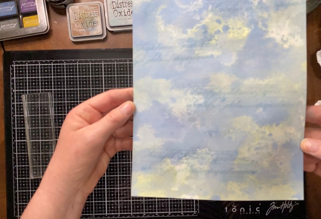 First, I started with my paper of course. I used Arteza, 140 pound, watercolor paper. I was planning on mounting my page on an 8″x10″ canvas so that it could be displayed. I cut my page down to 7″x9″ to give it a nice border of canvas around it. The first step to my background was my inks. I used Distress Oxide sprays on this make. The three colors I used were, Speckled Egg, Faded Jeans and Bundled Sage.