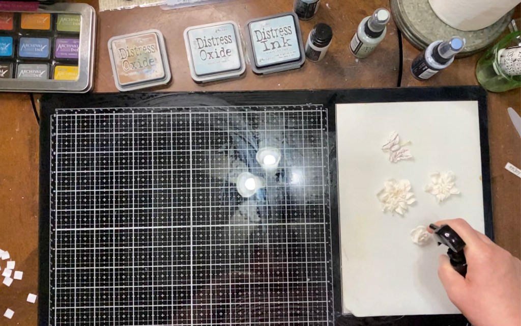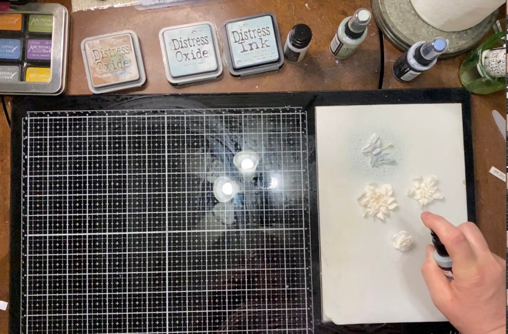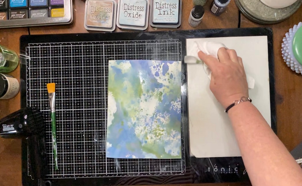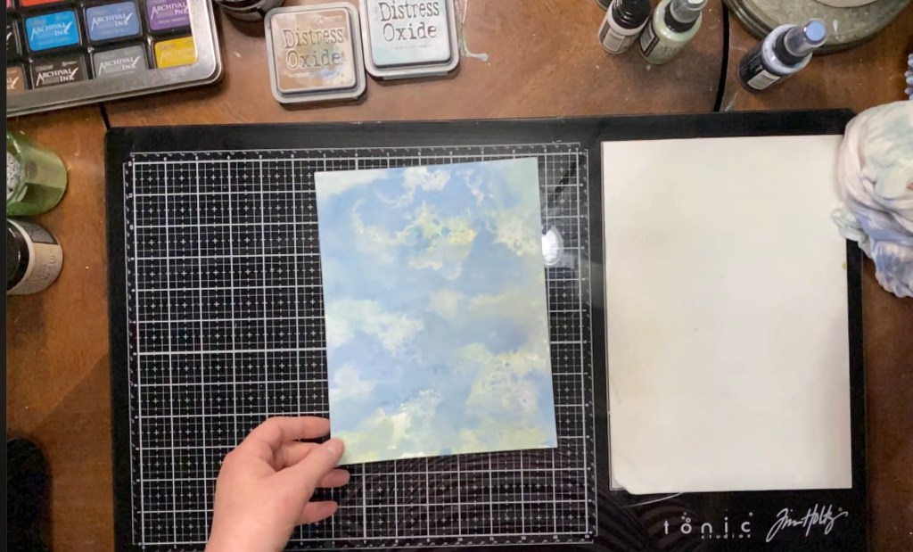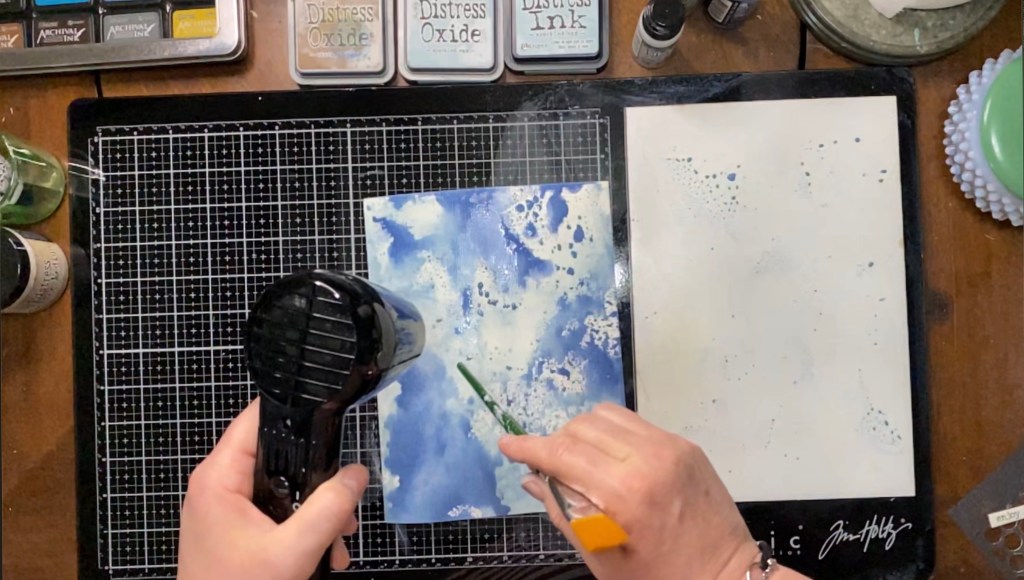 If you follow my blog, or YouTube channel, you have probably discovered that I use this technique quite a lot, or one similar to it. It’s very simple really. You will need your paper, your sprays or ink of choice, and a good working surface. I love working on my Tim Holtz glass media mat by Tonic. It’s a really nice surface if you do a lot of mixed media, and I do. It’s something about the glass. This mat also has a nonstick mat that just makes the inks do so well.
