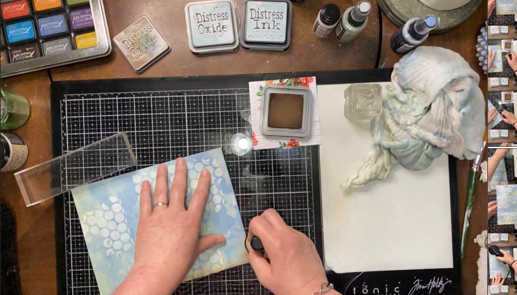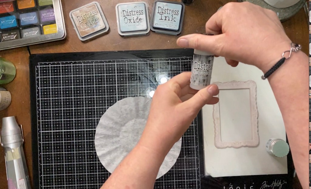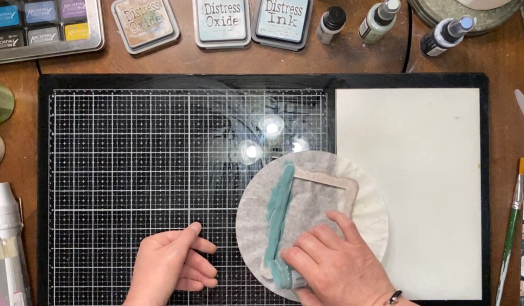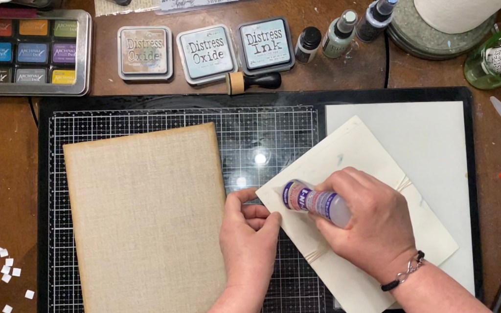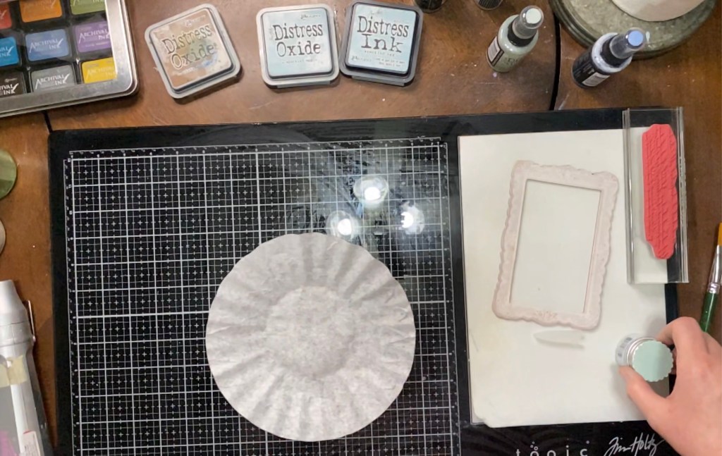 If you follow my blog, or YouTube channel, you have probably discovered that I use this technique quite a lot, or one similar to it. It’s very simple really. You will need your paper, your sprays or ink of choice, and a good working surface. I love working on my Tim Holtz glass media mat by Tonic. It’s a really nice surface if you do a lot of mixed media, and I do. It’s something about the glass. This mat also has a nonstick mat that just makes the inks do so well.