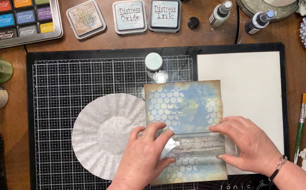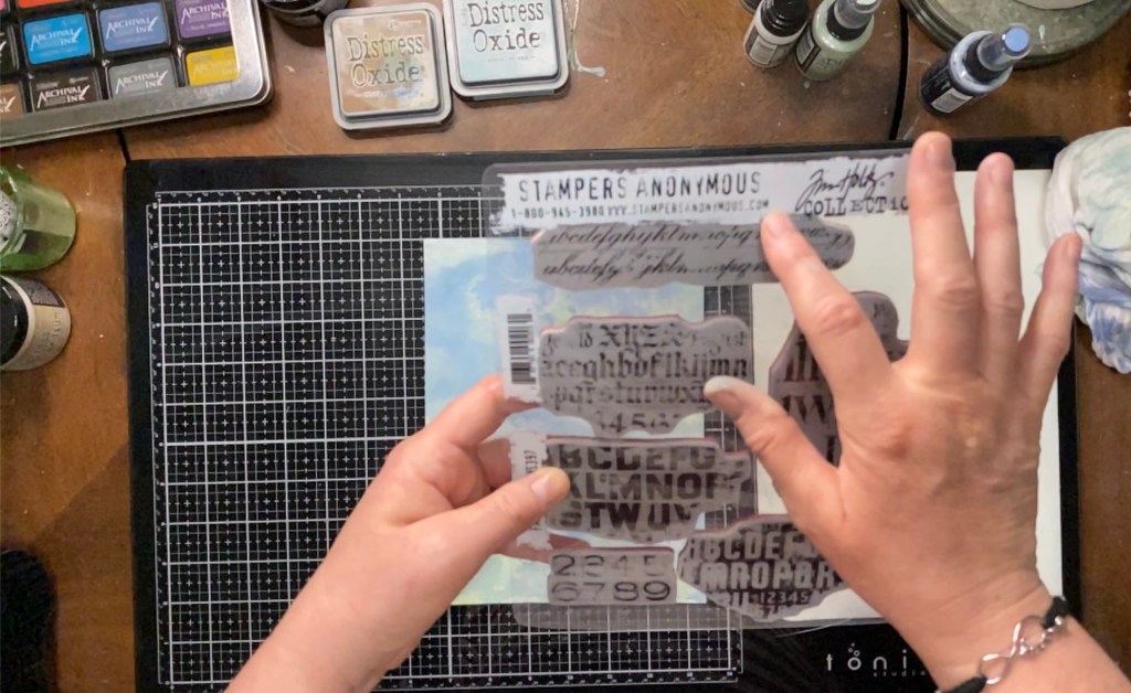 Once I was happy with the inks for my background, I added some stamping. My favorite, go-to background stamps these days is a set by Stampers Anonymous in the Tim Holtz collection. The name of the set is Faded Type and the number is CMS397. This set has some great alphabet stamps in several different fonts. I chose one that has a vintagey, scripty feel (yes, I may have just made those words up), since my make was going to have that vintage look. I used the Speckled Egg in the Distress ink for stamping the image. It gave it a faint script in the background; a nice touch.