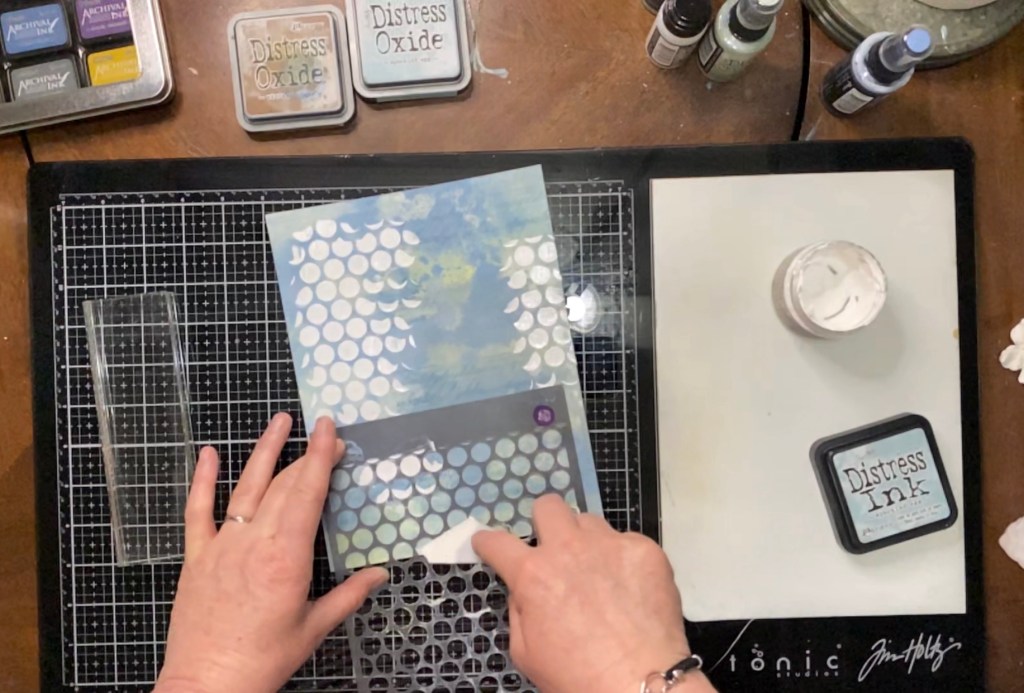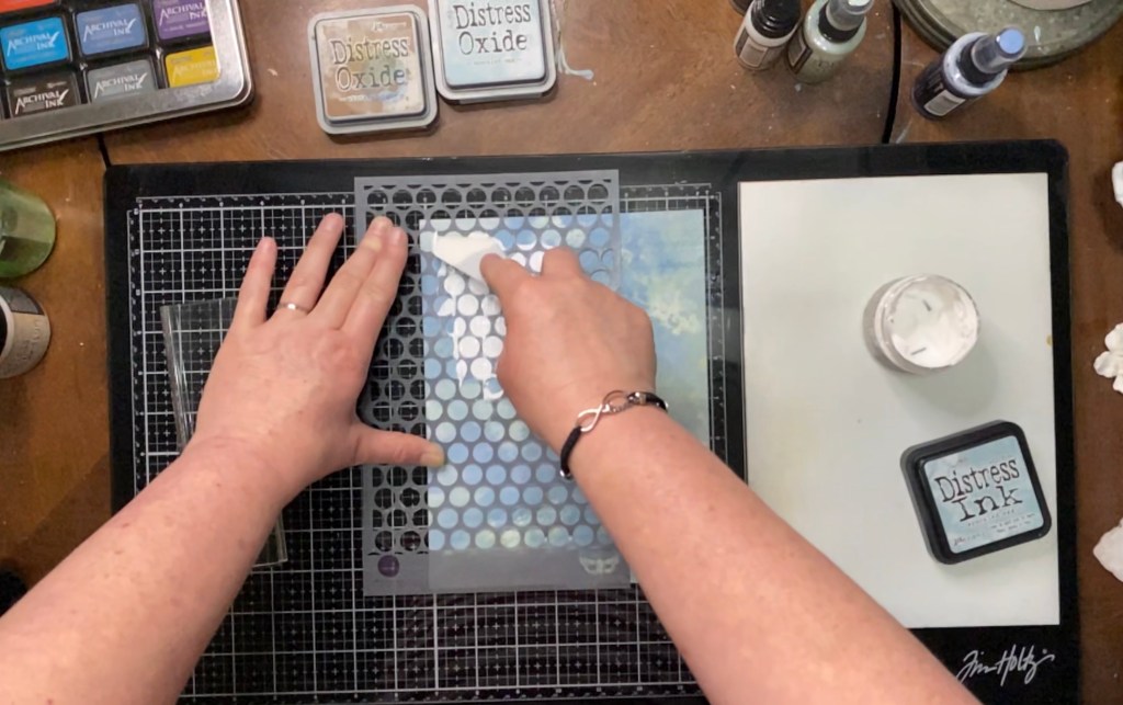 Next, I decided to add another layer to my background so that it had a little texture. I took a circle stencil that I’ve had forever, and my Distress Crackle Texture Paste. With a spatula, I spread the crackle paste over the stencil in a thin layer that was smooth with the edges of the stencil. Once that dried, it had that nice, crackle look. It reminds me of an antique piece of furniture that’s been painted so many times that it has loads of cracks in it. Love it!