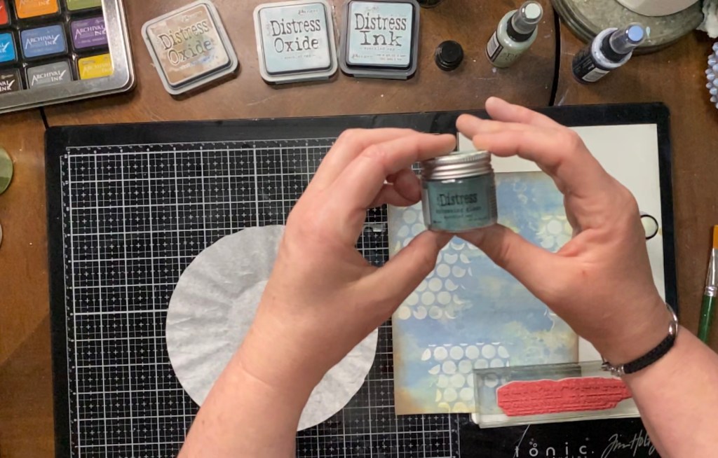 I felt like the font stamp needed to be a little bit darker, so I used a relatively new product from the Distress line, called Distress Embossing Glaze. I of course used the Speckled Egg. Distress Embossing Glaze works just like embossing powder. To emboss, you need an embossing ink of some kind, a stamp of your choice, an embossing powder of some type and an embossing tool. For this step, I used the Distress Embossing Dabber, the embossing glaze, the same stamp as before, and my embossing gun that I purchased years ago. First, you apply the embossing ink to the stamp. Then you stamp the image where you want it to be embossed. Sprinkle the embossing powder, or in this case embossing glaze, over the inked image. Then heat the image with your embossing tool until the powder melts and the image becomes shiny.
