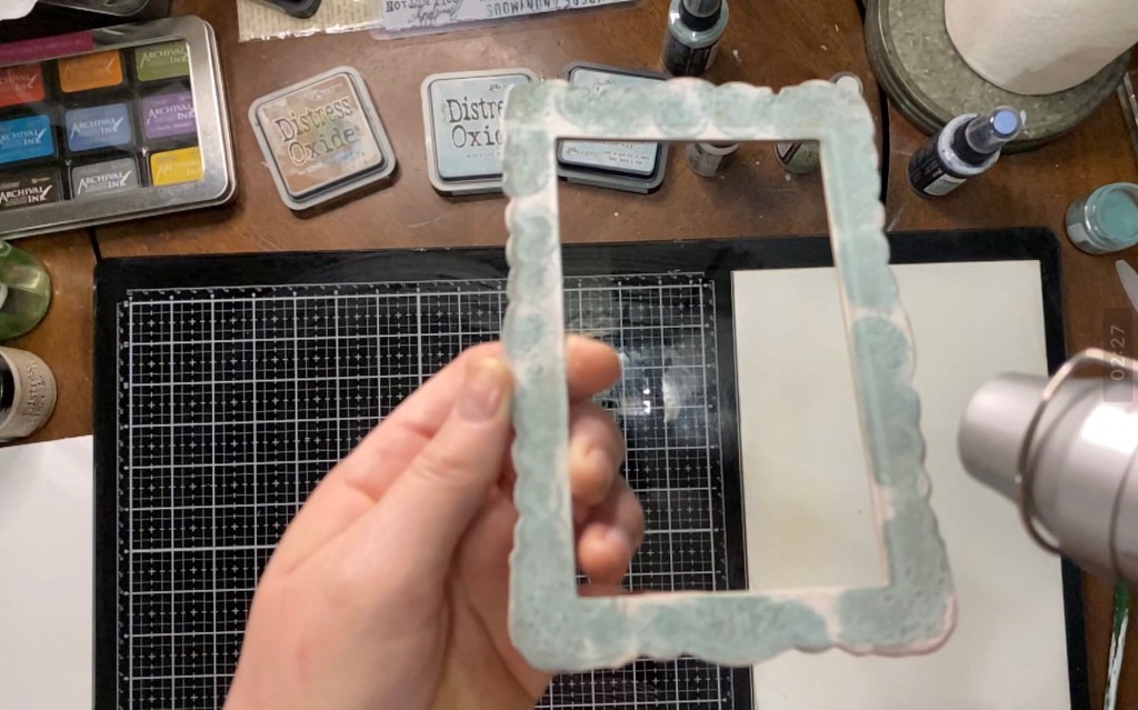 I added a Tim Holtz Lace Printed Baseboard frame to the mix, but not before I embossed it with the distressed embossing glaze also. And yes, It was Speckled Egg! I had to do it twice though, because the first time didn’t get a very good coverage. I was going for something that I just didn’t accomplish. Haha. It happens sometimes. But, once it was done, the shine made it look like as if it was an actual porcelain frame. Love it!!