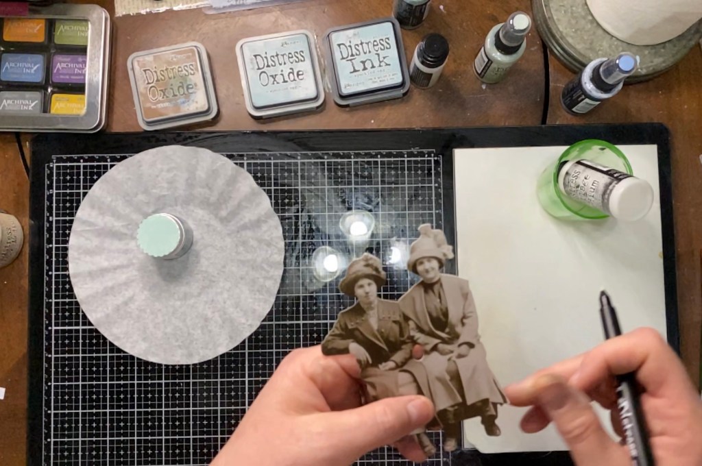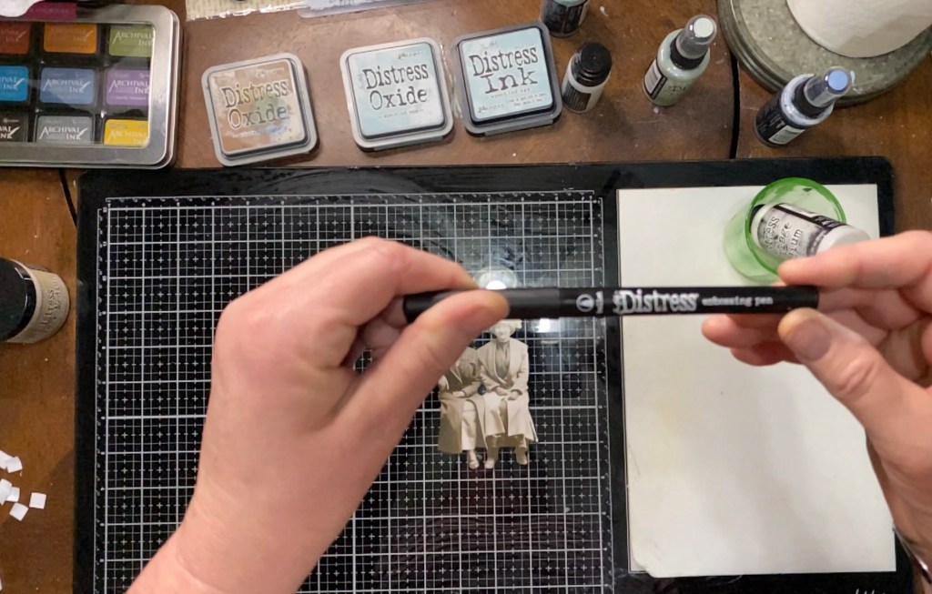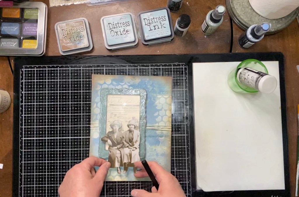I chose one of the paper dolls from the Tim Holtz collection. This particular paper doll is of two ladies that look like what I would call “shelf sitters”. They are a perfect fit for the frame. I used my Distress embossing pen (glue in pen form) to emboss just a few details to give it a little extra pop. As you can see, the blue details really pop on this make.