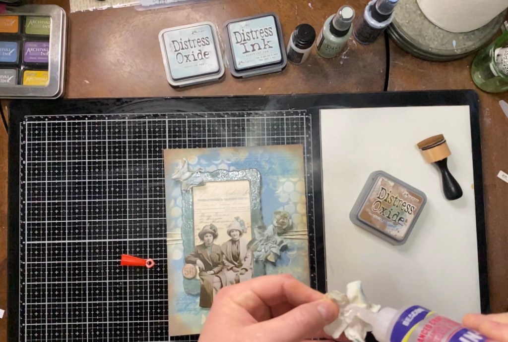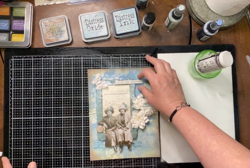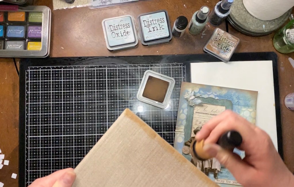 The next step, and one of my favorites for any vintage looking make, was to distress the edges of the page. For this, I took my Distress Oxide ink in Vintage Photo and a blending tool. A blending tool is just what it says, a tool used for blending. The tool has a wooden handle and a piece of Velcro stapled to the business end of the tool. this end holds a blending foam that has a Velcro backing. I have a blending foam for each color of my inks and they are stored nicely on the bottom side of the ink pad with a piece of Velcro. To “distress” a project, you simply work your blending tool in a circular motion, while turning your page or project to ink the edges. I just love the effect it gives the page. It frames it in nicely.