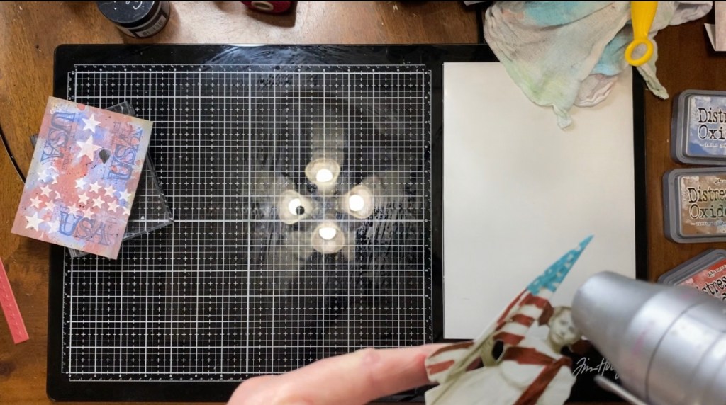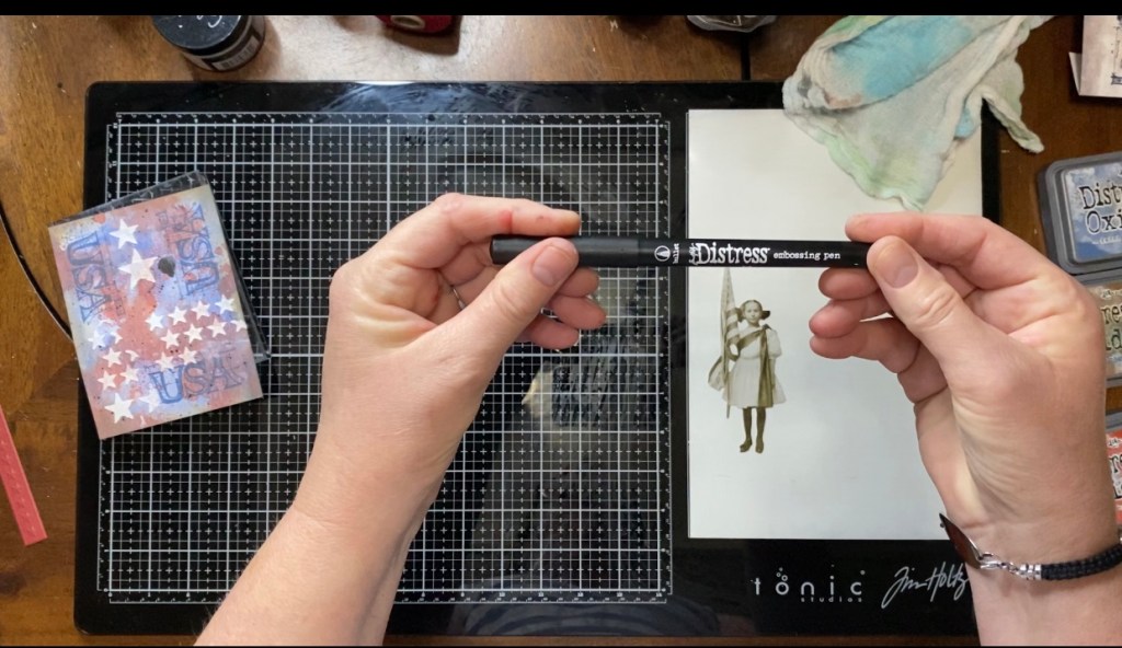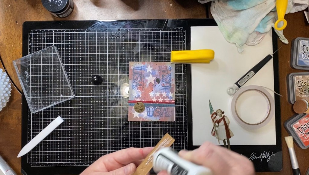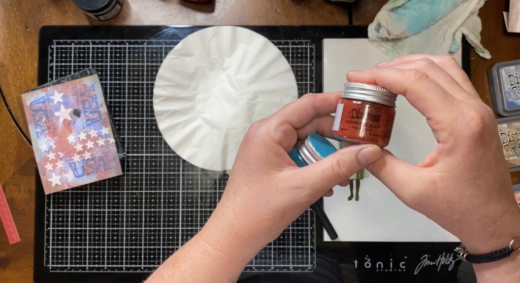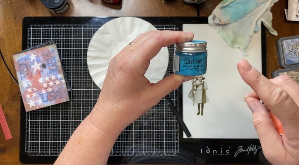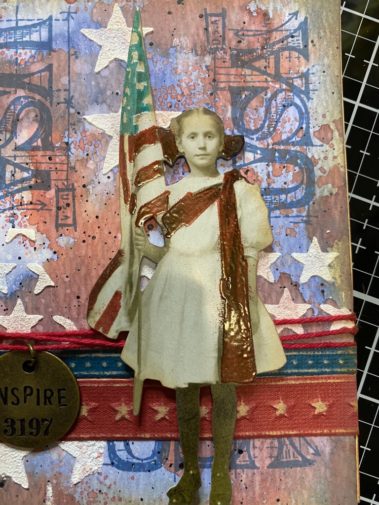 I was going through my paper-dolls for last weeks make, and remembered seeing the cutie holding the American flag. So, naturally, she was a must have for today’s make. I used my Distress Embossing Pen, coffee filters, and my Distress Embossing Glazes for the next technique. The colors of glazes I chose were Fired Brick and Broken China. Broken China turned out to be a little too light, but it was the bluest blue I had. HahA. I used my Distress Embossing pen to color the spots that I wanted highlighted. The first color I used was the Fired Brick. I colored some of the flag, here sash, and her hair bows. Then, I sprinkled the Fired Brick over the areas and used a brush to brush off the areas I didn’t want it. Then I used my embossing gun to heat and melt the embossing glaze. I did the same steps with the Broken China on parts of the flag. I then took the Vintage Photo Distress ink, again, and distressed the edges of my paperdoll.