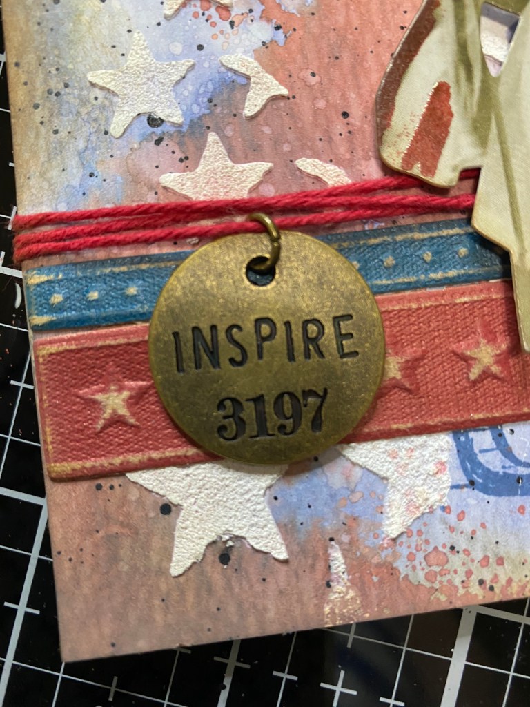 I found an Idea-ology tag, “Inspire”, in my stash, so I used a jump ring and some red bakers twine to use it as an embellishment on the card. I used glue dots on the back to keep the twine in place and threaded the twine thru the jump ring to hang it on the card. I wrapped the twine 3-4 times around the card and used another glue dot to hold it in place. I used my Xpress-It double sided tape to adhere the background to the blank card base.