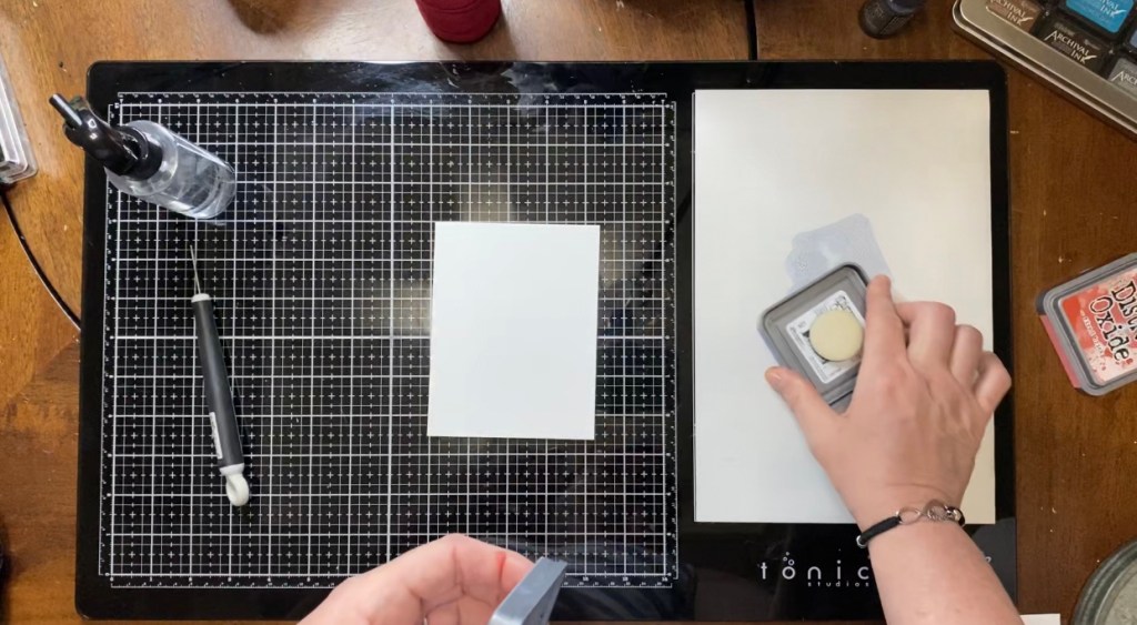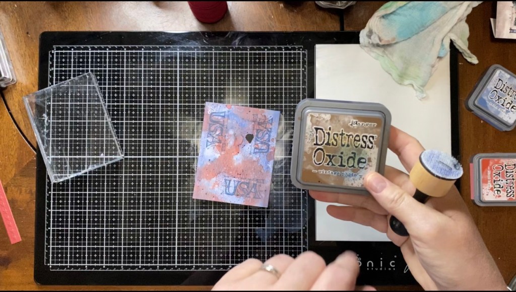 Next step was the distressing the edges. I did try the Faded Jeans first, but it wasn’t dark enough to show up on the background. So I went with the trusty, Vintage Photo. You can never go wrong with Vintage Photo. You take your Ranger Blending Tool and foam, and in a circular motion, spread the ink around the edge of your paper. it gives it that nice, vintage, famed in look.