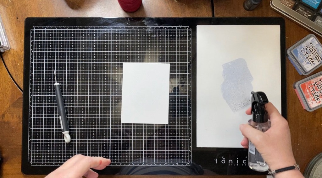 After I applied the Fired Brick, I was happy with the coverage. It still had a few white spots, but that kinda went with that Red, White and Blue theme was going for. Next, I took my Distress Sprayer of water, and barely squeezed the trigger to get some pretty good sized water droplets on my background. Distress Oxides react very nicely with water and if you dab it off, it leaves nice water marks on your page.