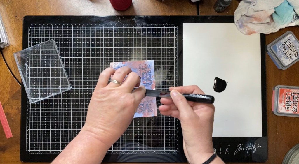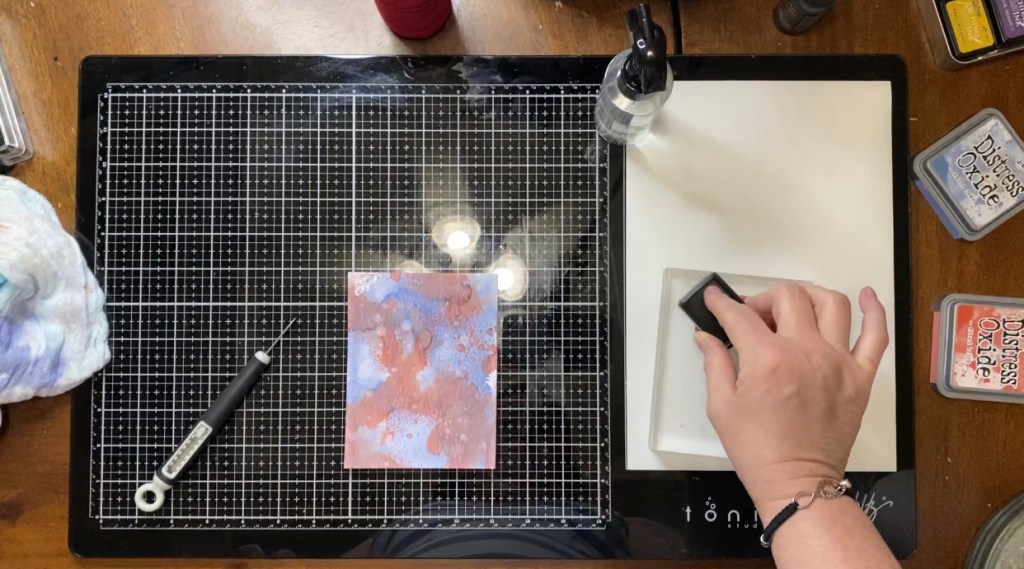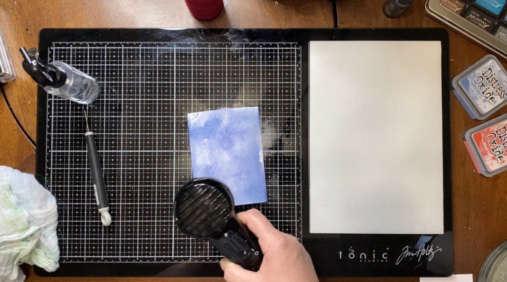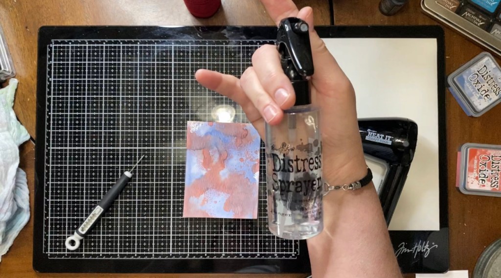 My make today was a card. I used the Tim Holtz Distress Watercolor Card stock for my background. The size of this paper is 4-1/4″ x 5-1/2″ so it’s perfect to make your project on and glue to a blank card base. And, that’s what I did. My inks today were Distress Oxide inks, Fired Brick and Faded Jeans. I used my favorite technique of spreading some of the Faded Jeans ink onto my Tim Holtz Glass Media Mat by Tonic, and spritzing it with some large water droplets with my Distress Sprayer bottle of water. I then took my paper and dabbed it into the ink mixture until I was happy with the coverage. I used my Ranger Heat It tool to make sure it was good and dry and then proceeded to do the same thing with the Fired Brick.