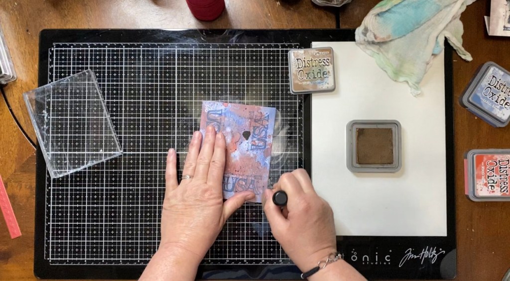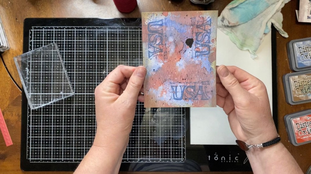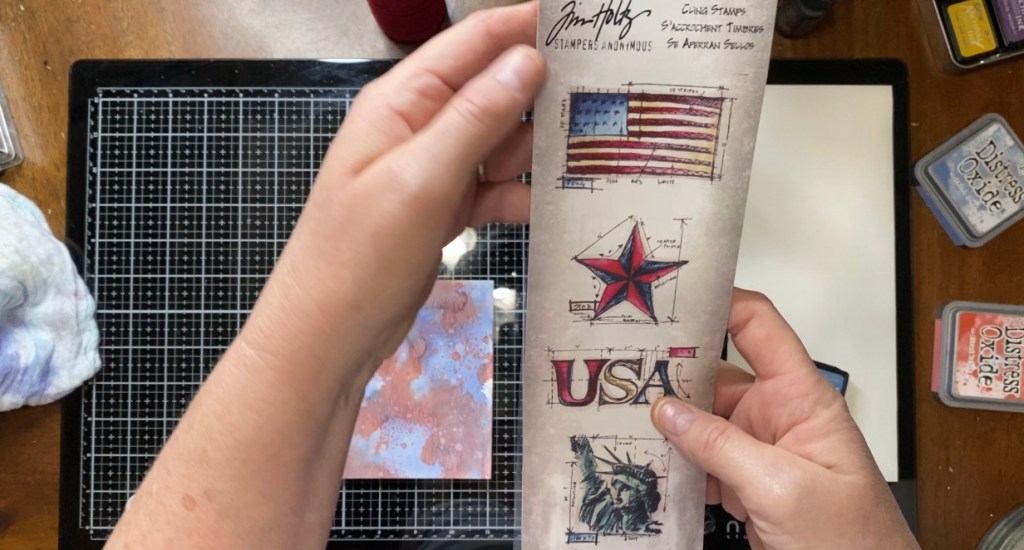 The next thing I did to my background was a little bit of stamping. I always like to add a little bit of text into the background to give it a nice, layered and kinda grungy look. This is where the Americana set came into play. I used the “USA” blueprint stamp for my text. For the stamping I used Distress Archival Ink Faded Jeans.