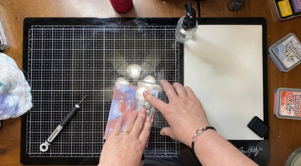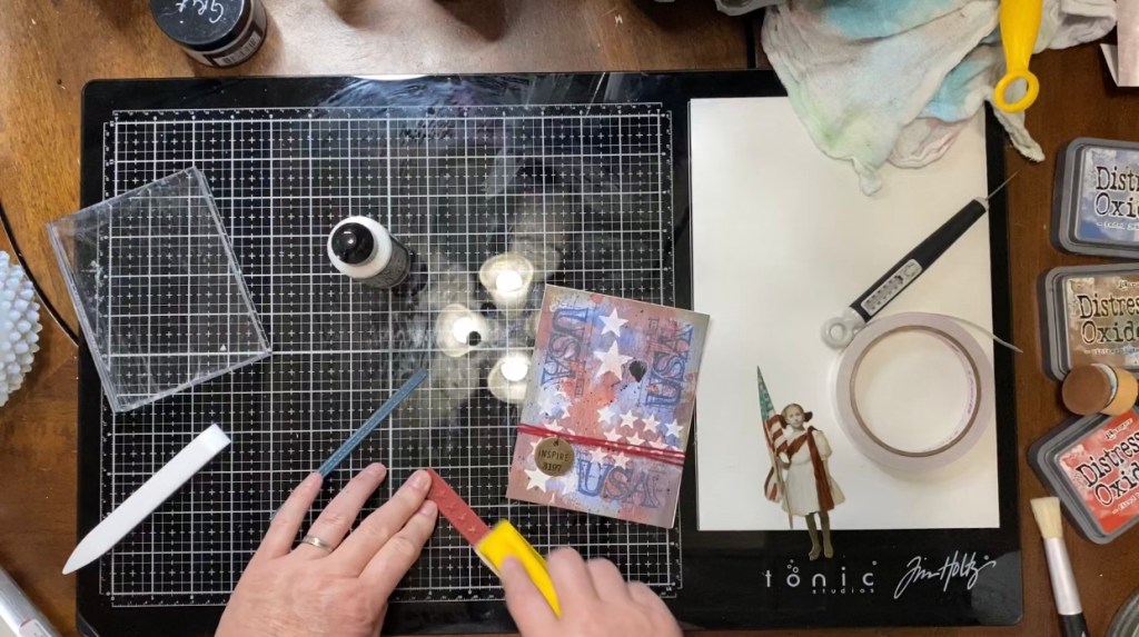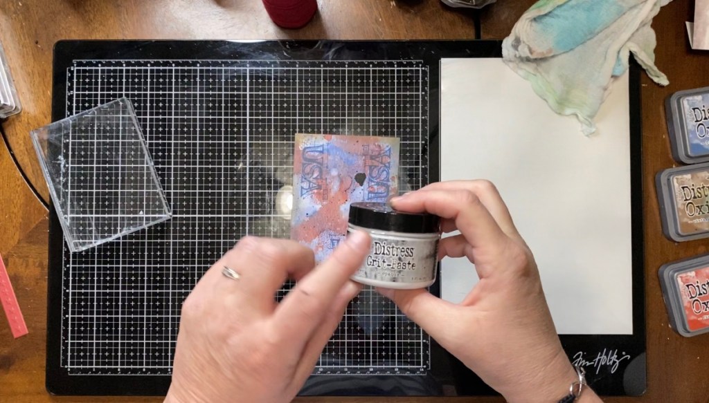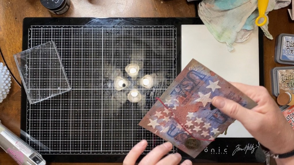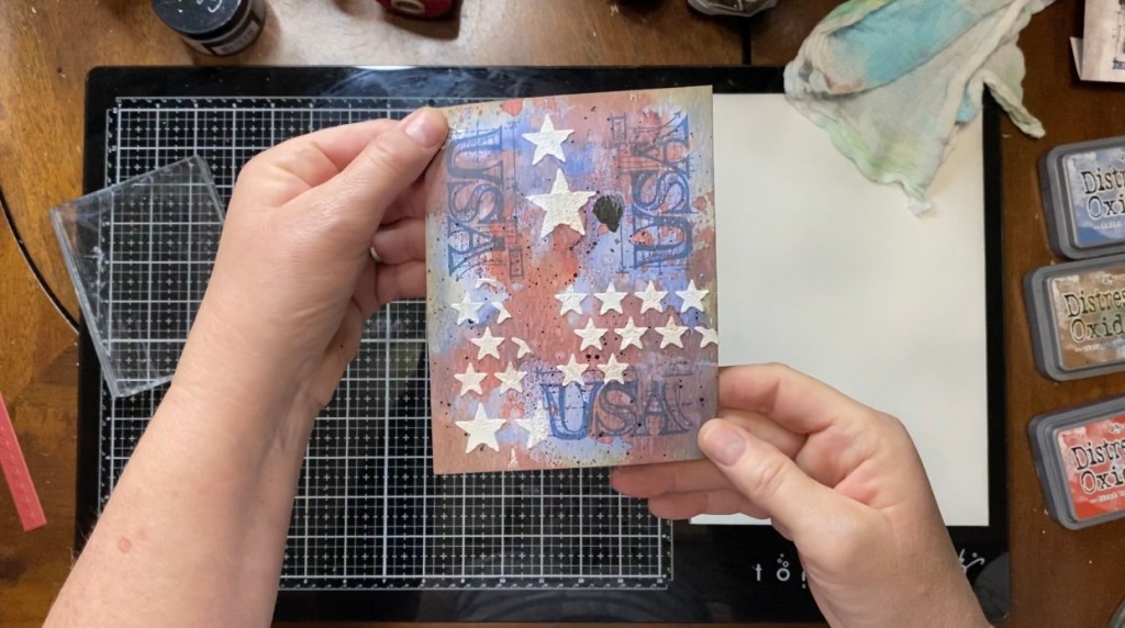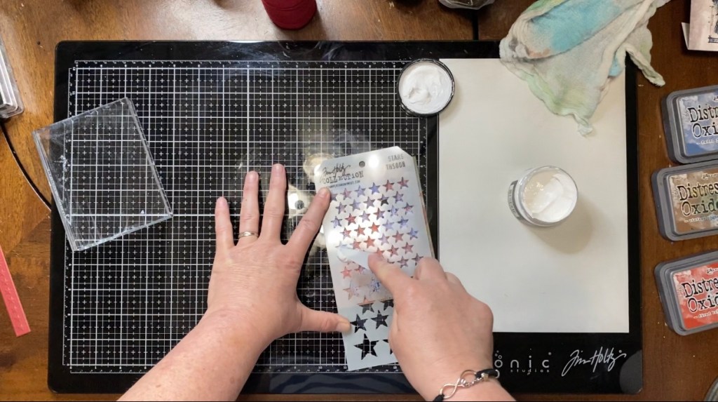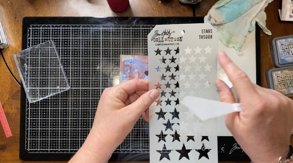 I’m not sure any background is complete without a little texture of some kind. Today I chose the Distress Grit paste. I find that the grit paste doesn’t absorb too much of the color from your inks, and I wanted my stars to pop nice and white. And, I think these did. I used the Stars layering stencil (THS008) from Stampers Anonymous, a palette knife, and the grit paste to spread just a few stars here and there on the background. After that, I was done with the background.