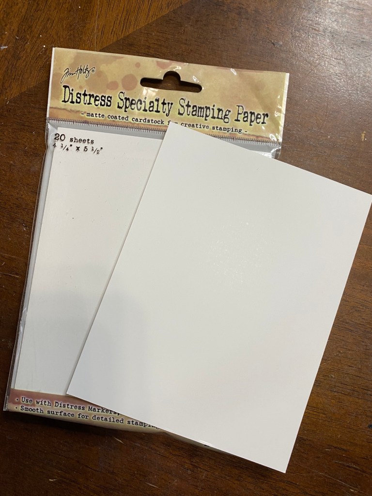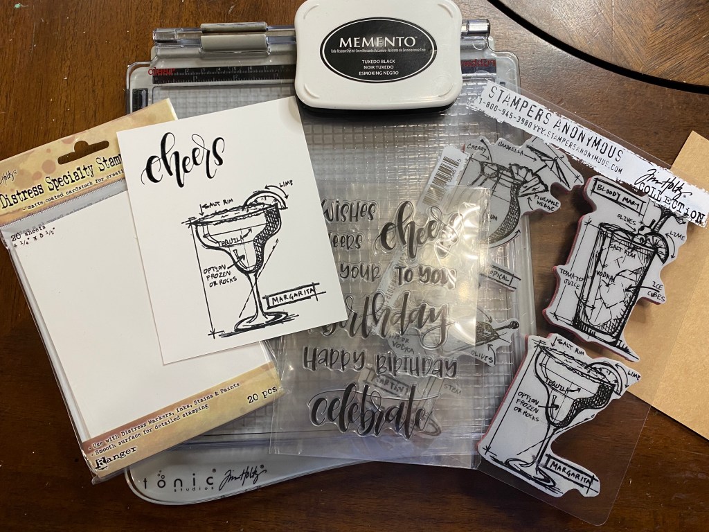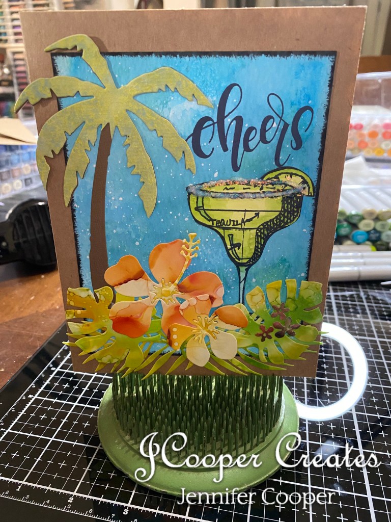 I decided to go with a Kraft card base this time. For my background, I used the Distress Watercolor cardstock and my Distress Oxides. The colors I chose today were Mermaid Lagoon, Cracked Pistachio, Broke China, and Tumbled Glass. I smudged a little of my Mermaid Lagoon onto my nonstick mat on my glass media mat, then spritzed it with some water. Then I dabbed my paper into the mix until I was happy with the coverage. I did this same procedure on the other three colors. Once I was happy with the coverage, I spritzed my paper with a little water and dried with my Ranger Heat It Tool. With the Ranger Distress Specialty Stamping Paper, and my Memento ink, I stamped my Margarita from the Stampers Anonymous Cocktails Blueprint (CMS335) stamp set by Tim Holtz. My cheers sentiment is from a set I’ve had for a few years and it’s stored just as pictured. It has no card or manufacturer or part number. Sorry.