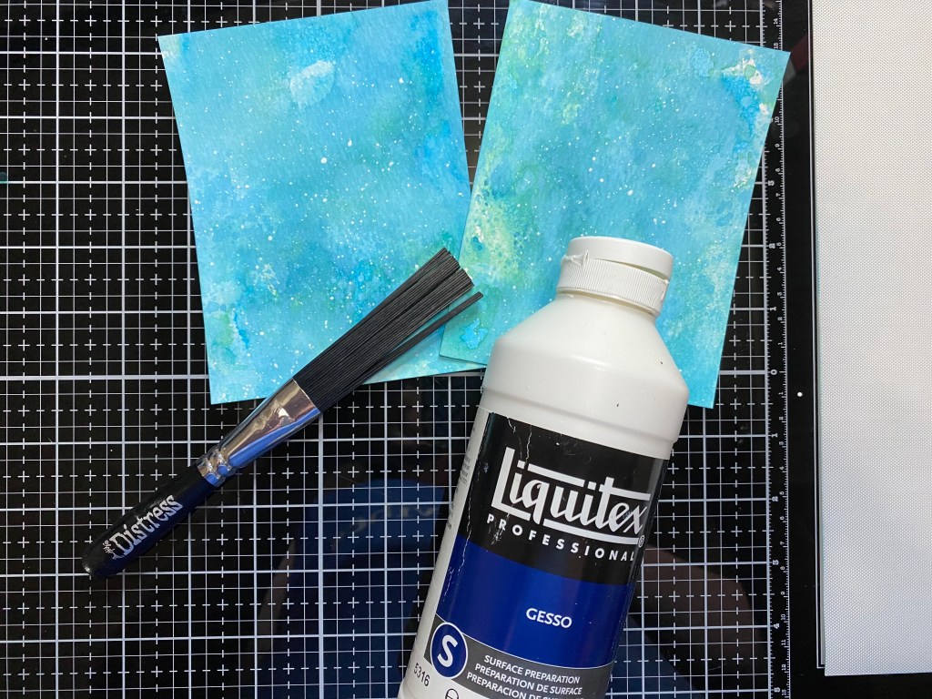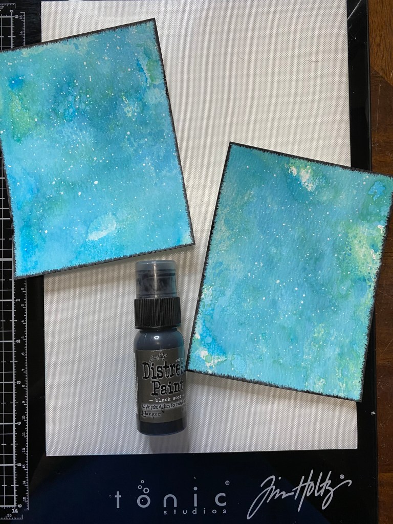 The next thing I did, I took my Distress Splatter brush and my Liquitex White Gesso and splattered some small dots of white onto that blue background. I dried it with my Heat It tool and then framed the edges by distressing my paper with the Black Soot Distress Paint. Once I made sure everything was good and dry, I taped it to my card base with my X-Press-It double sided tape.