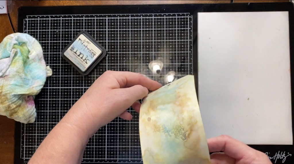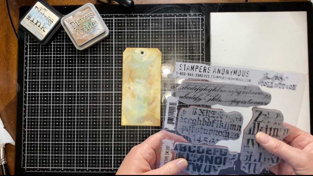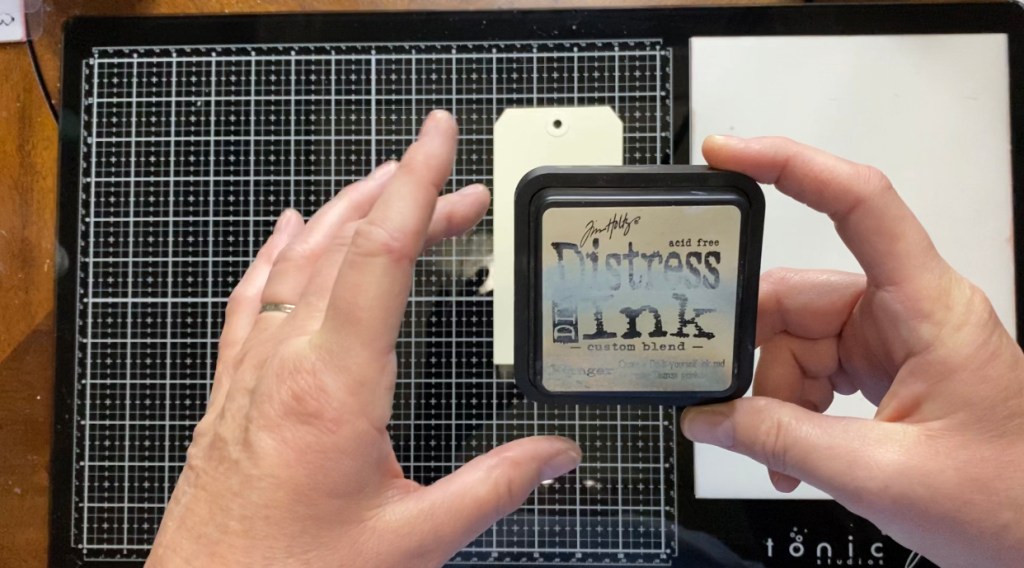 The tag that I used was a mixed media tag from the Tim Holtz Distress line from Ranger. It is great for mixed media projects. I actually tried a DIY custom blend today. I got the “recipe” from @kathinwesthill on Instagram. If you follow the Simon Says Stamp Monday Challenge, then you know her as Kath Stewart. I LOVE this blend, and I thank her for sharing it on FB. Here are the colors if you would like to make your own as well: Antique Lined (DI), Speckled Egg (DO), Old Paper (DI) and Frayed Burlap (DO). The blend is AMAZING. You just add a little to your non-stick mat and spritz with water. Then you dab your paper, or tag in this case, in the mix. You may have to do this a few times until you are happy with the coverage. I think I did maybe three? Four??