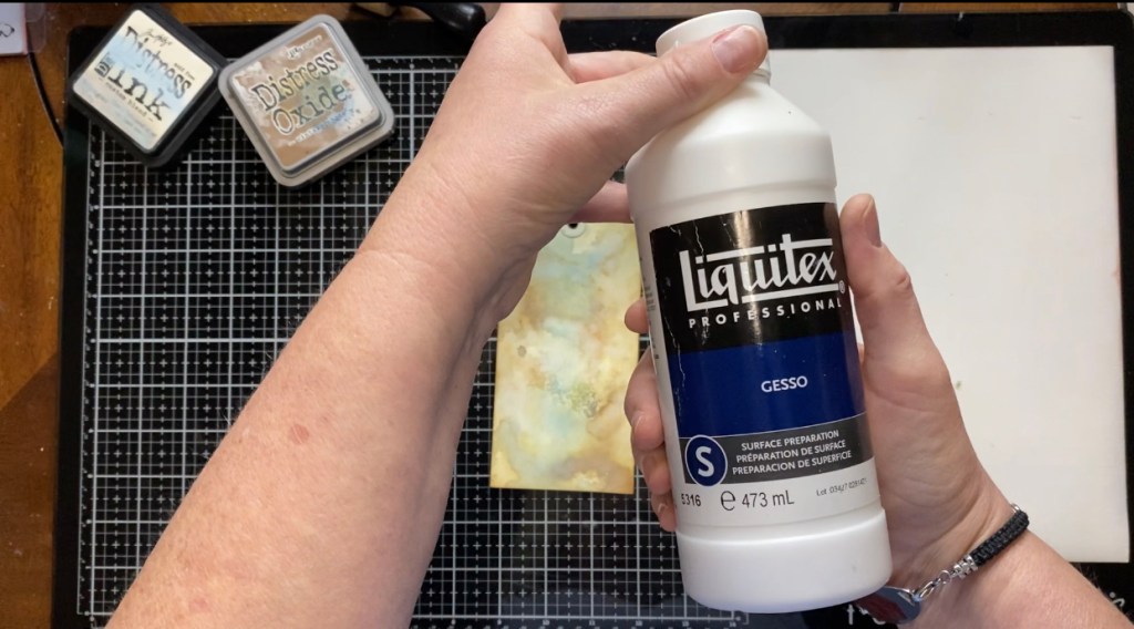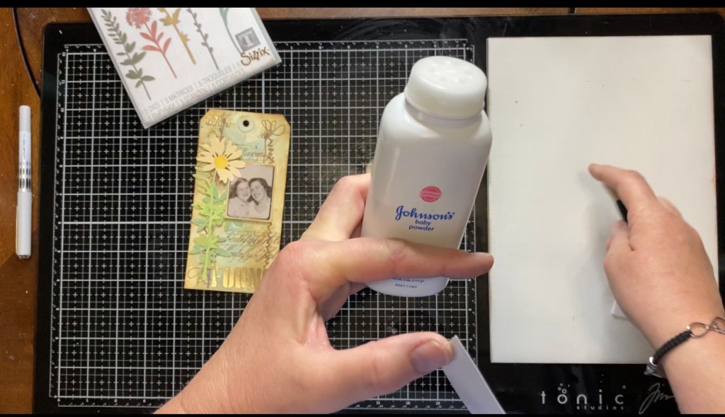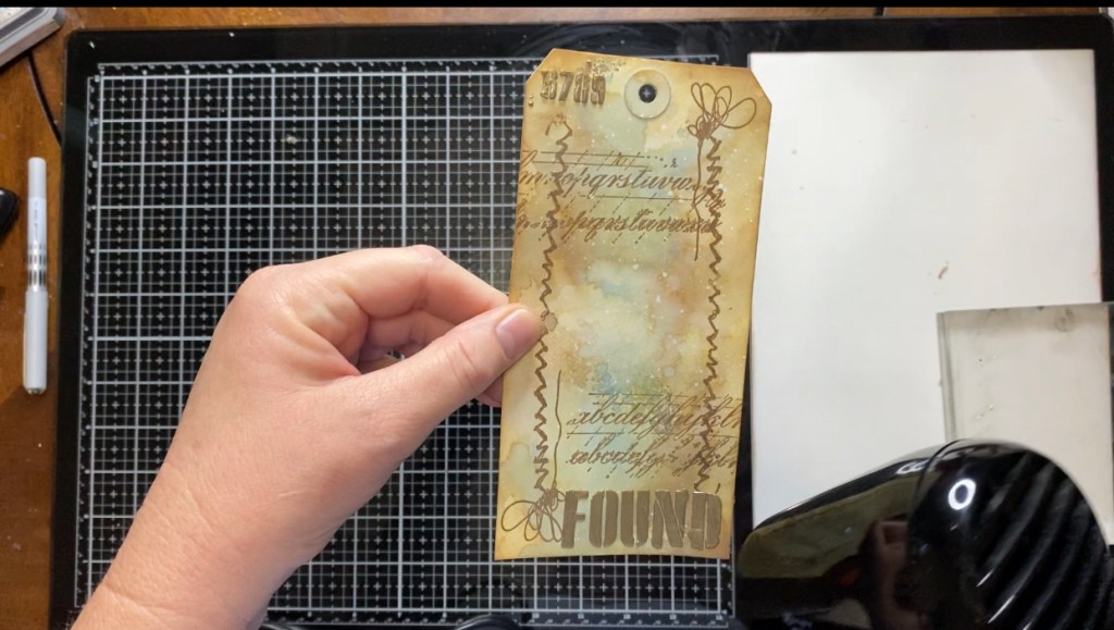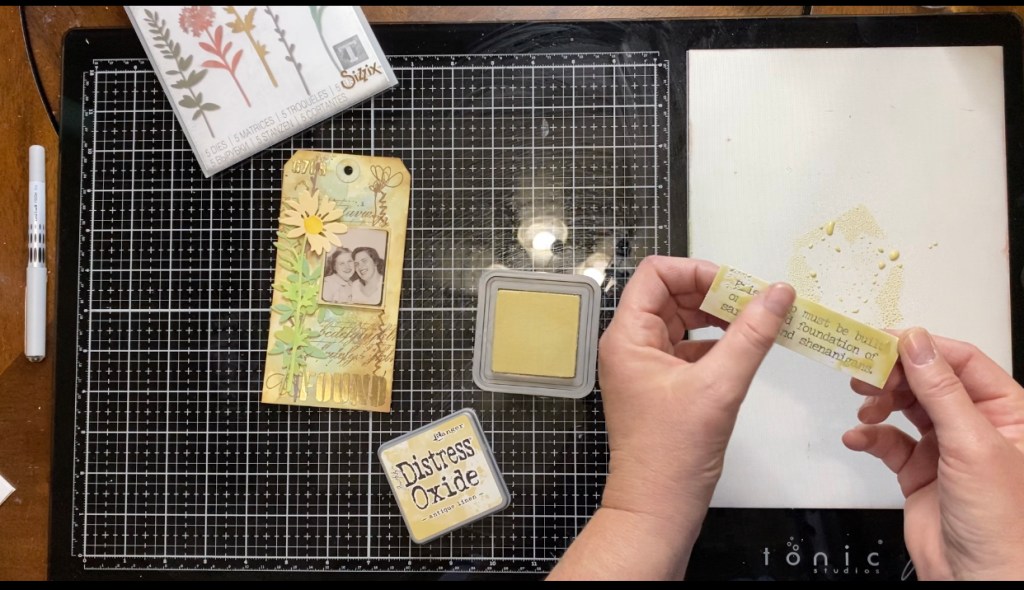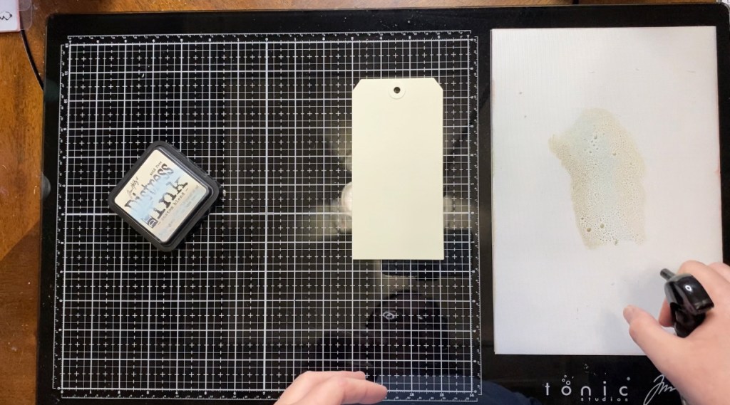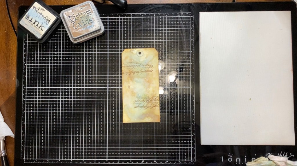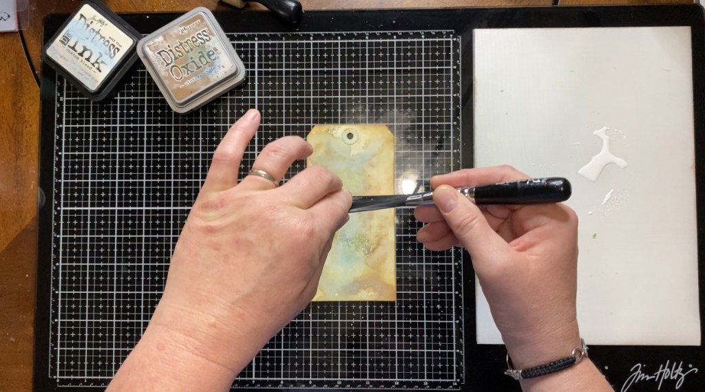 When I was happy with the coverage on my tag, I distressed the edges with some Vintage Photo Distress Oxide with my blending tool. Then, I used my white Gesso and my Distress Splatter brush to splatter some white droplets onto the tag. I am really getting the hang of this splatter brush thing. Haha. Practice, practice.