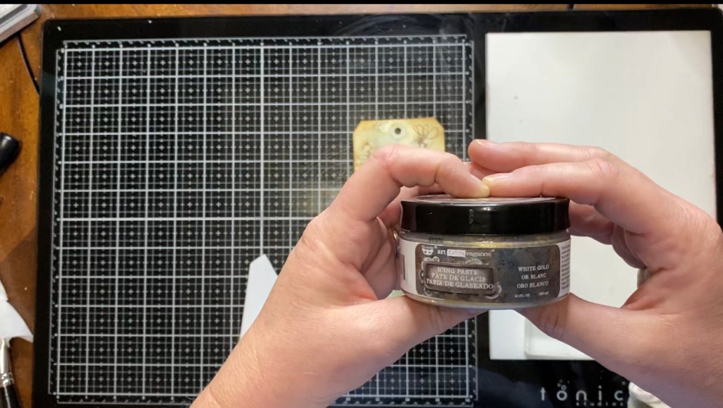 I have found a new love in Finnabair Icing Paste. I just love the shimmer. I used a limited edition stencil that has the word found on it, so I used that and my Icing paste to give it a little shine. Icing paste is a little thinner than normal texture paste, but same concept and you’re left with a great metallic effect on your project.
