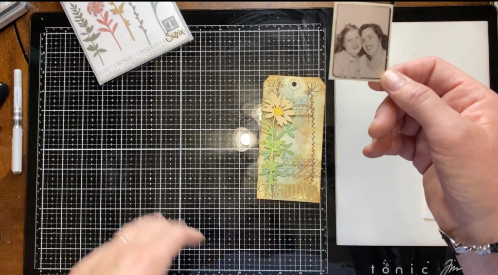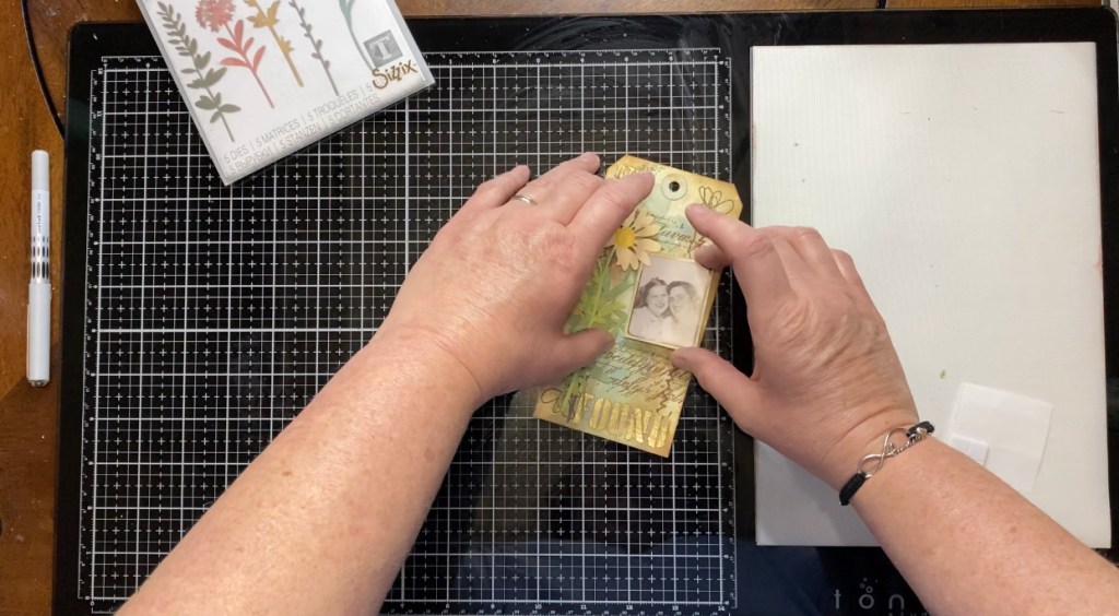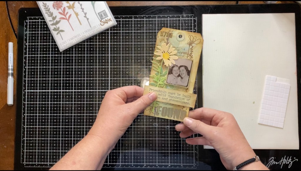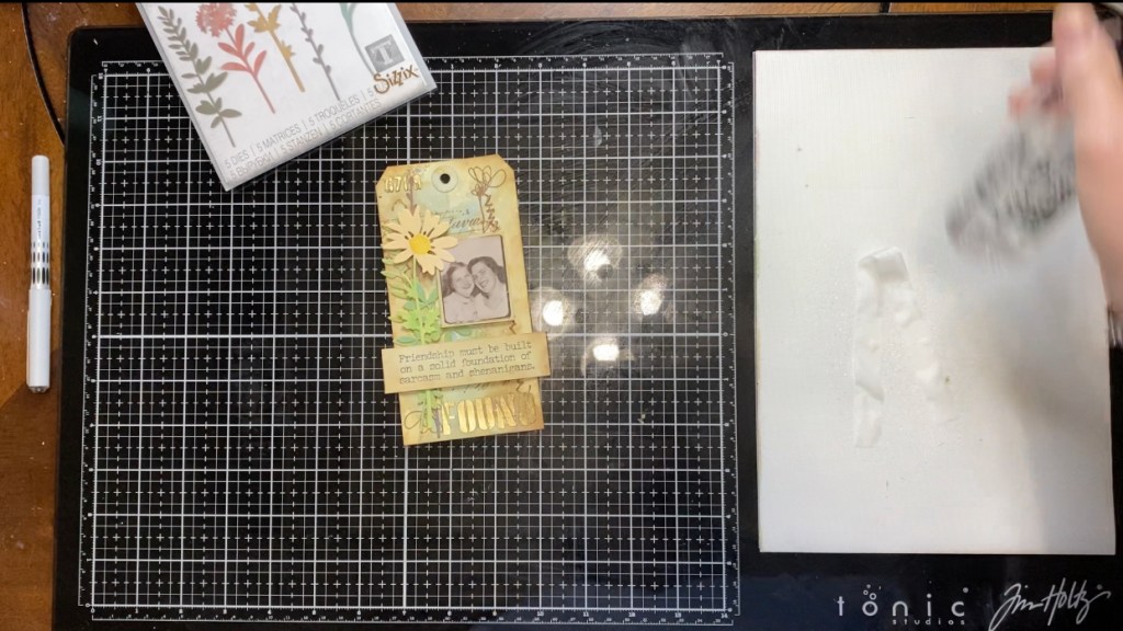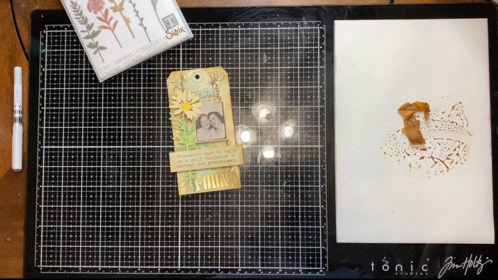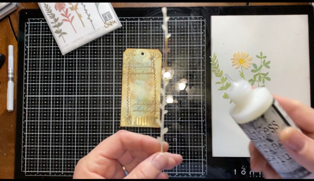If you follow my blog, then you’ll remember I had a Vagabond party a while back. When I say Vagabond party, what I mean is this: I took almost a whole weekend, inking water color paper and mixed media paper. I then took several of my die sets and cut out tons of items with my Sizzix Vagabond. One of the sets that I used was the Sizzix Wildflower Stems #1 (664163). I have used these on several projects. If fact, it may be time for another Vagabond party. Once I decided where I wanted them to go, I used my Distress Collage Medium to adhere them to the tag.