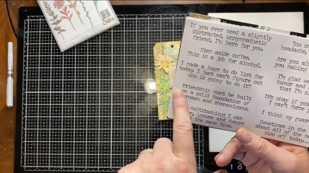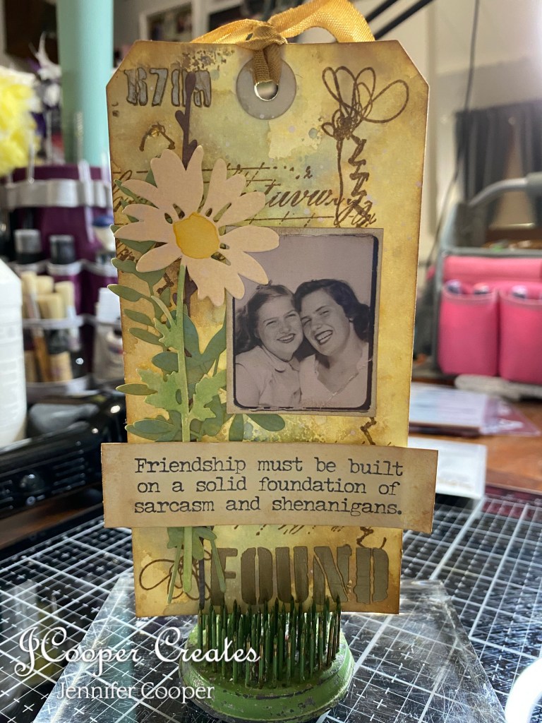 Next, I found a really cute Photobooth picture of these two friends laughing and having a good time. I distressed the edges with my Vintage Photo, and pop dotted it to the tag. I then picked my sentiment out of the Snarky Big Talk sticker book. I think I found the perfect pic and sentiment to go together. “Friendship must be built on a solid foundation of sarcasm and shenanigans.” I LOVE it. I think there is no truer saying than that. And, If you know me at all, I do have a tiny bit of sarcasm running through my veins as well.