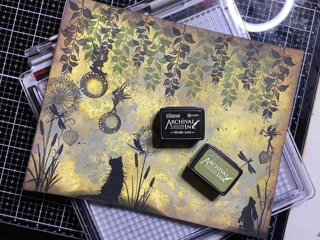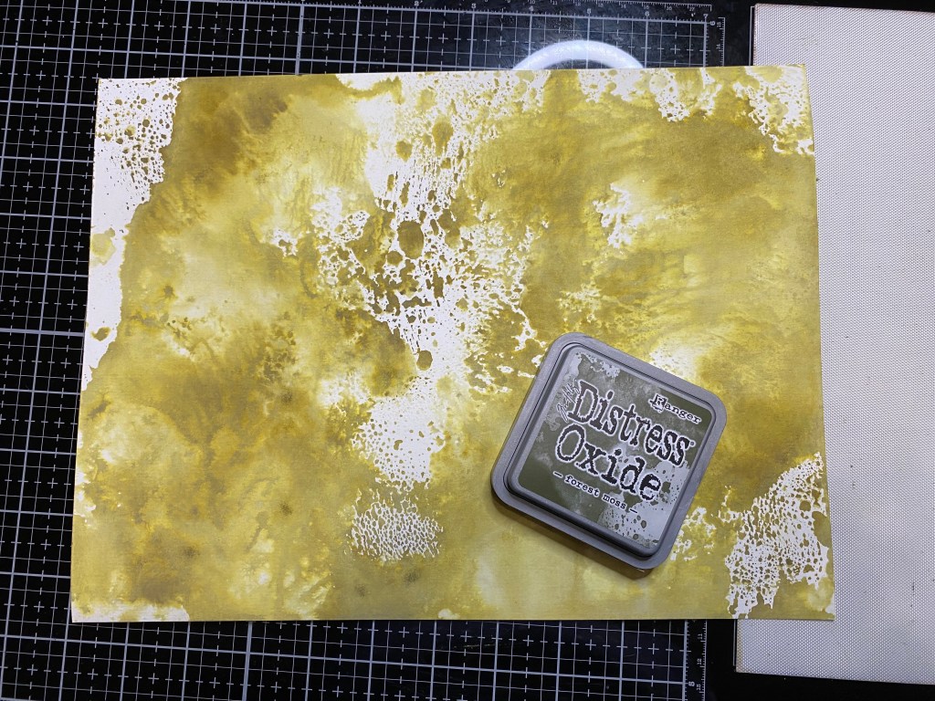 Todays substrate was watercolor paper from Arteza. I used the smooth side of the paper because I knew I was going to be doing alot of stamping. For my background I used my Distress Oxide Ink pads. The colors were Forest Moss and Peeled Paint. Perfect selecetion for a swampy bayou. LOL. I smudged a little of the Forest Moss onto my nonstick mat and spritzed it with some water. I dabbed my paper into the mix until I was happy with the coverage. I dried the paper really well with my Ranger Heat It tool and then did the same procedure with the Peeled Paint. I think I had to do this about two times for each color until I was happy. Once it was good and dry, I used my Peeled Paint and a blending tool to fill any spaces I wasn’t completely happy with. Once I was completely happy, LOL, I cut my paper down to 8″x10″ because I think I want to possibly frame it.