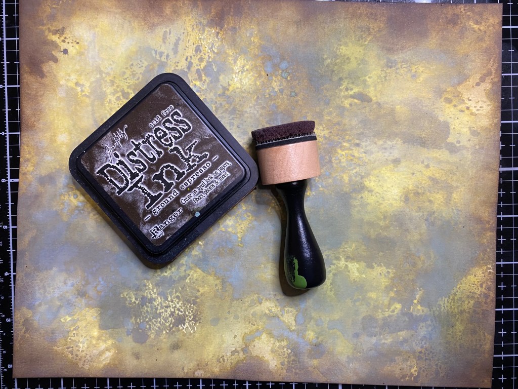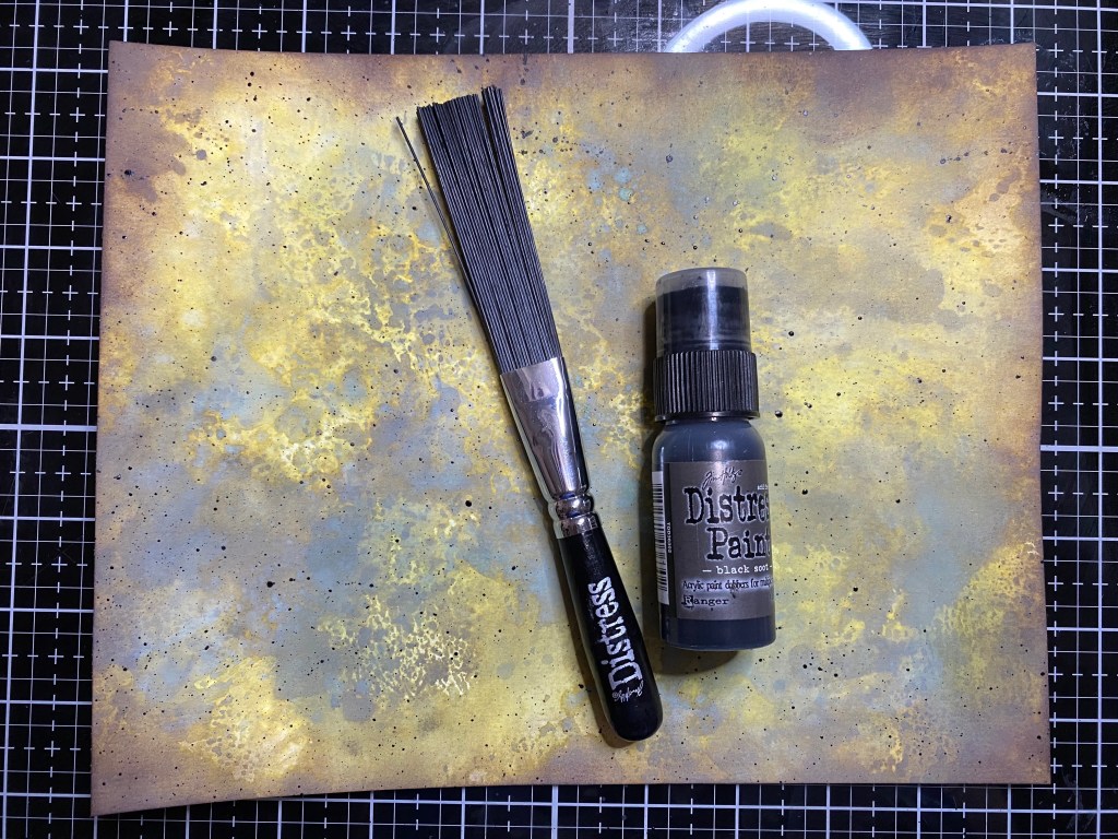 Next, to finish out my background, I distressed the edges with some Ground Espresso Distress Ink. Then, I used my Distress Splatter Brush and my Black Soot Distress Paint and splattered a little black paint.