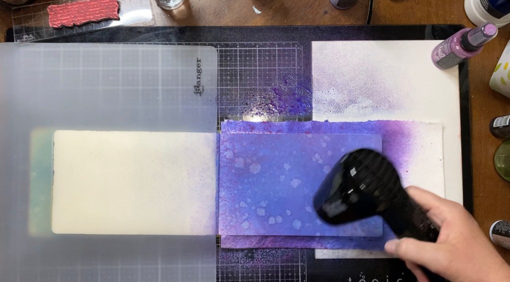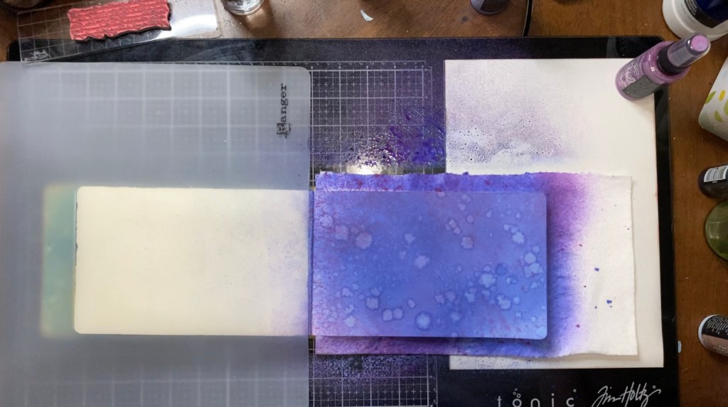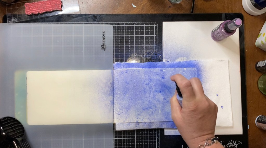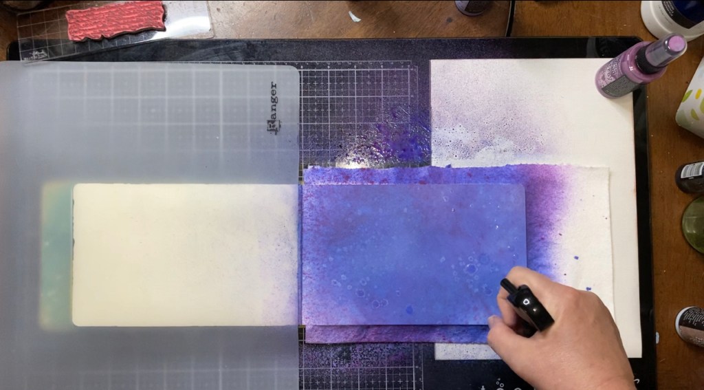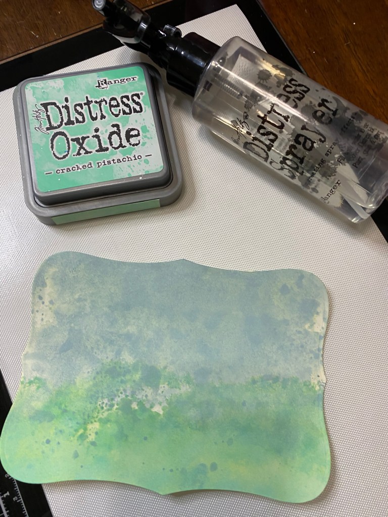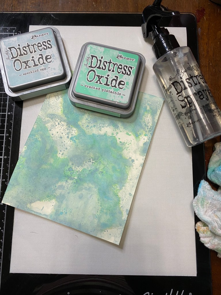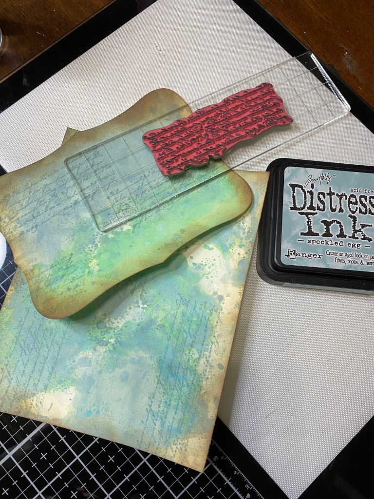 I used a kraft paper, blank card base, and my Dylusions Mixed Media Cardstock. And of course, with my Stampers Anonymous Tim Holtz Stamps, I went with Distress Oxide Sprays. The colors I chose were Peeled Paint, Crushed Olive, and Shabby Shutters. I used my favorite technique of spraying a little of the spray on my non-stick glass media mat and spritzed it with a little bit of water. I then dabbed my paper into the ink droplets until I was happy with the coverage. I made sure it was good and dry with my Ranger Heat It tool before moving on to the next color. I of course used the same technique for all three shades of green.