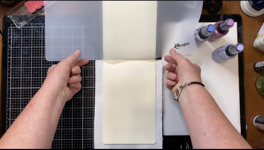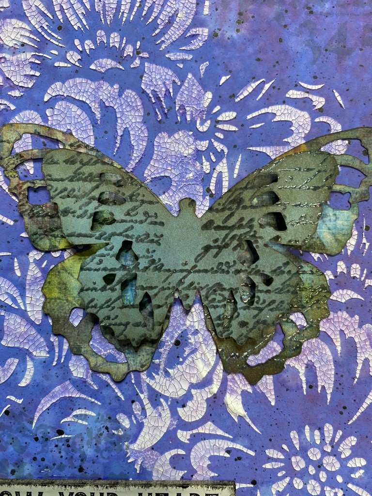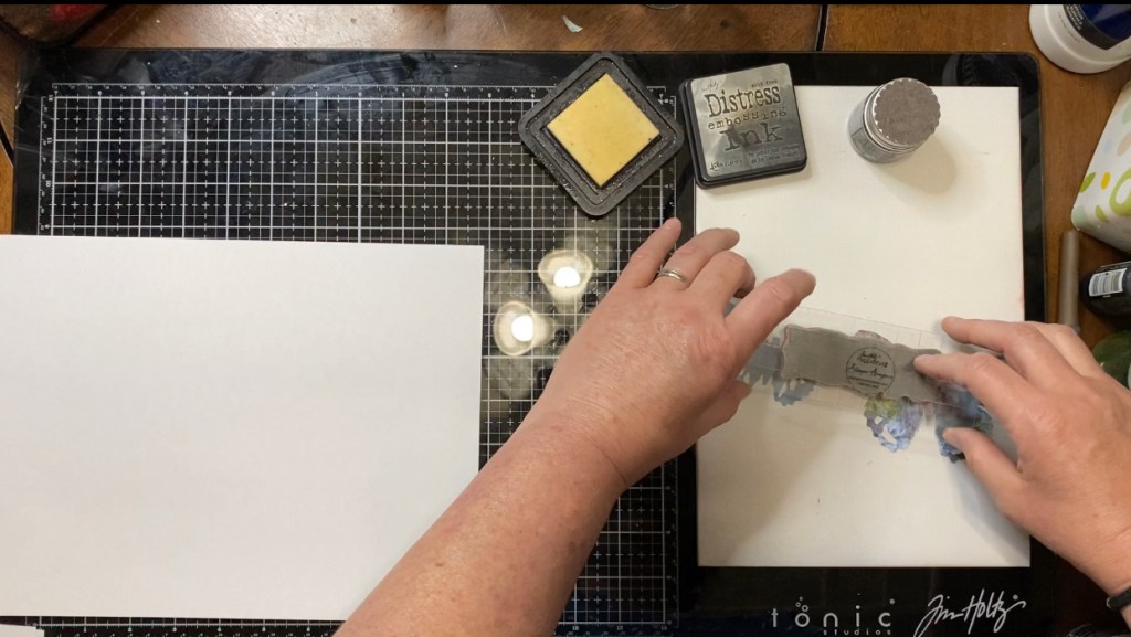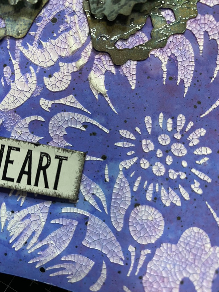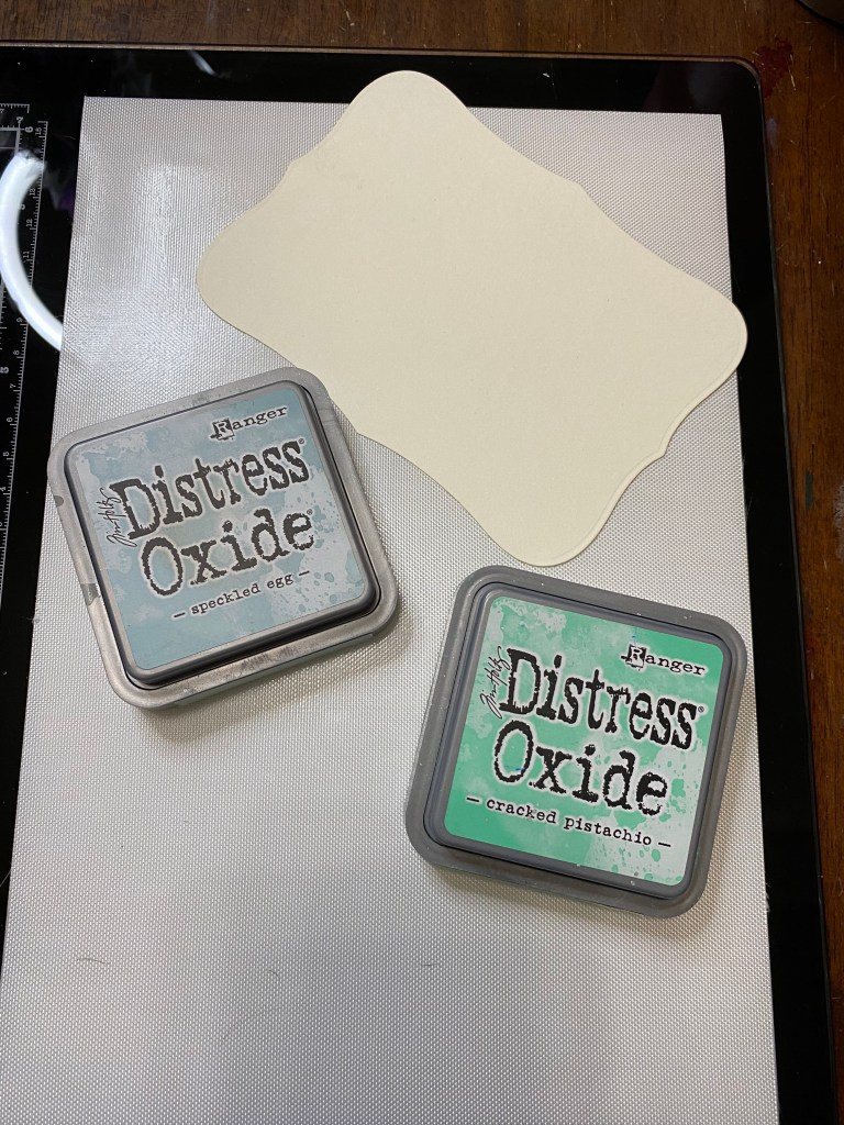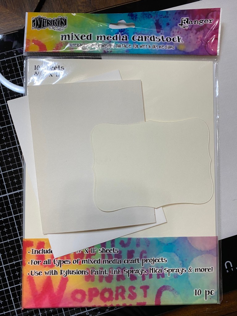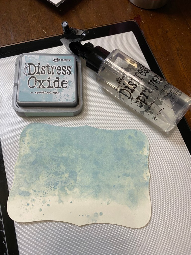 I used a kraft paper, blank card base, and my Dylusions Mixed Media Cardstock. And of course, with my Stampers Anonymous Tim Holtz Stamps, I went with Distress Oxide Sprays. The colors I chose were Peeled Paint, Crushed Olive, and Shabby Shutters. I used my favorite technique of spraying a little of the spray on my non-stick glass media mat and spritzed it with a little bit of water. I then dabbed my paper into the ink droplets until I was happy with the coverage. I made sure it was good and dry with my Ranger Heat It tool before moving on to the next color. I of course used the same technique for all three shades of green.