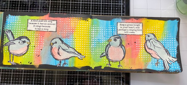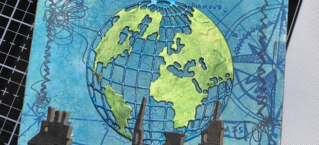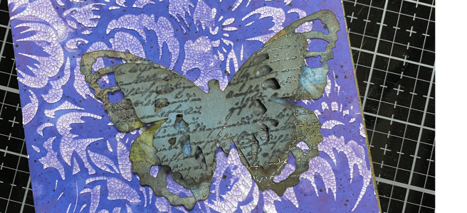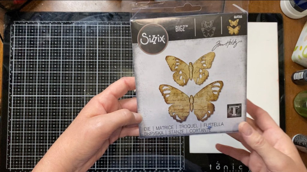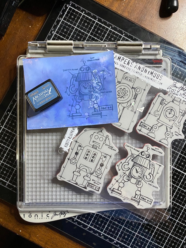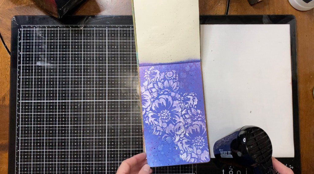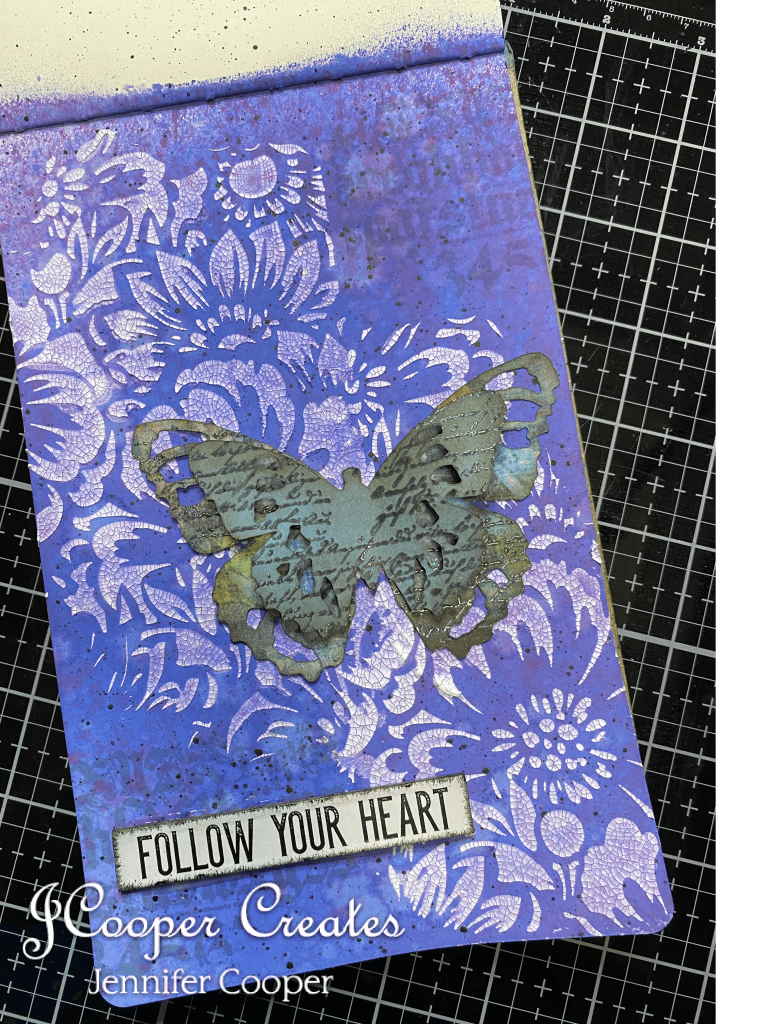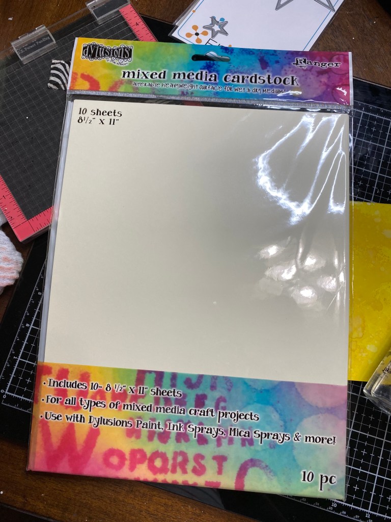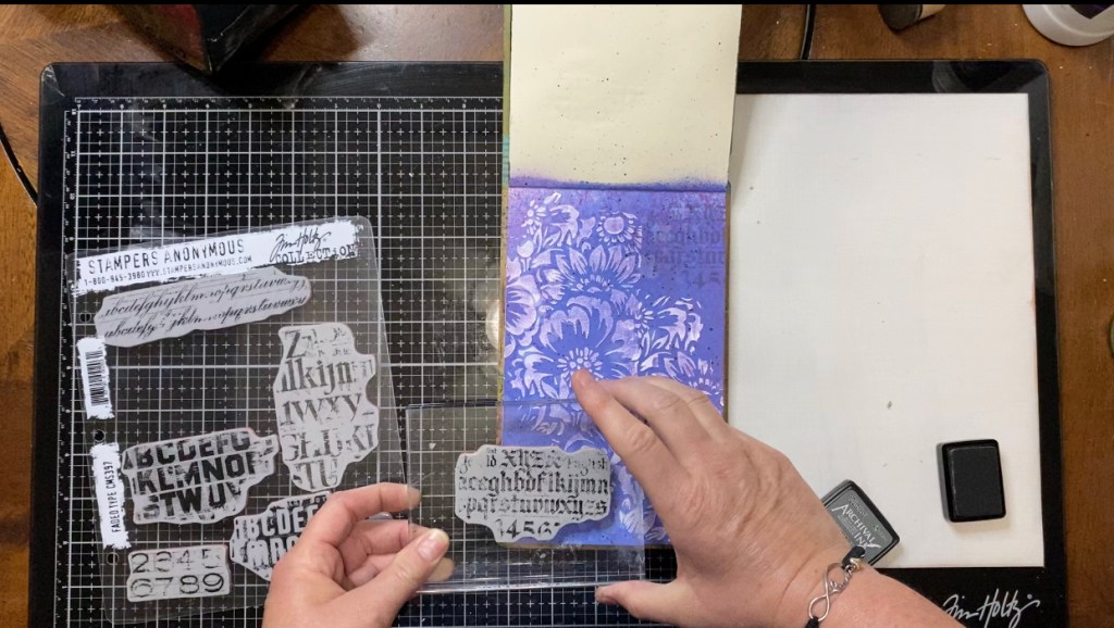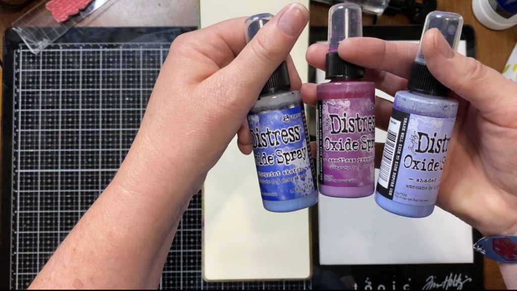 I used a kraft paper, blank card base, and my Dylusions Mixed Media Cardstock. And of course, with my Stampers Anonymous Tim Holtz Stamps, I went with Distress Oxide Sprays. The colors I chose were Peeled Paint, Crushed Olive, and Shabby Shutters. I used my favorite technique of spraying a little of the spray on my non-stick glass media mat and spritzed it with a little bit of water. I then dabbed my paper into the ink droplets until I was happy with the coverage. I made sure it was good and dry with my Ranger Heat It tool before moving on to the next color. I of course used the same technique for all three shades of green.
