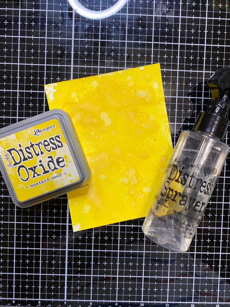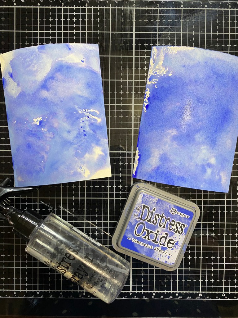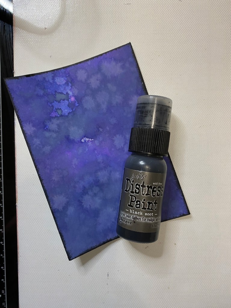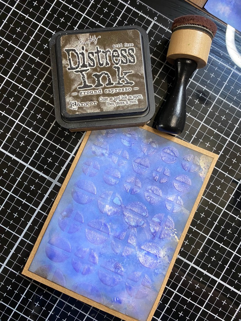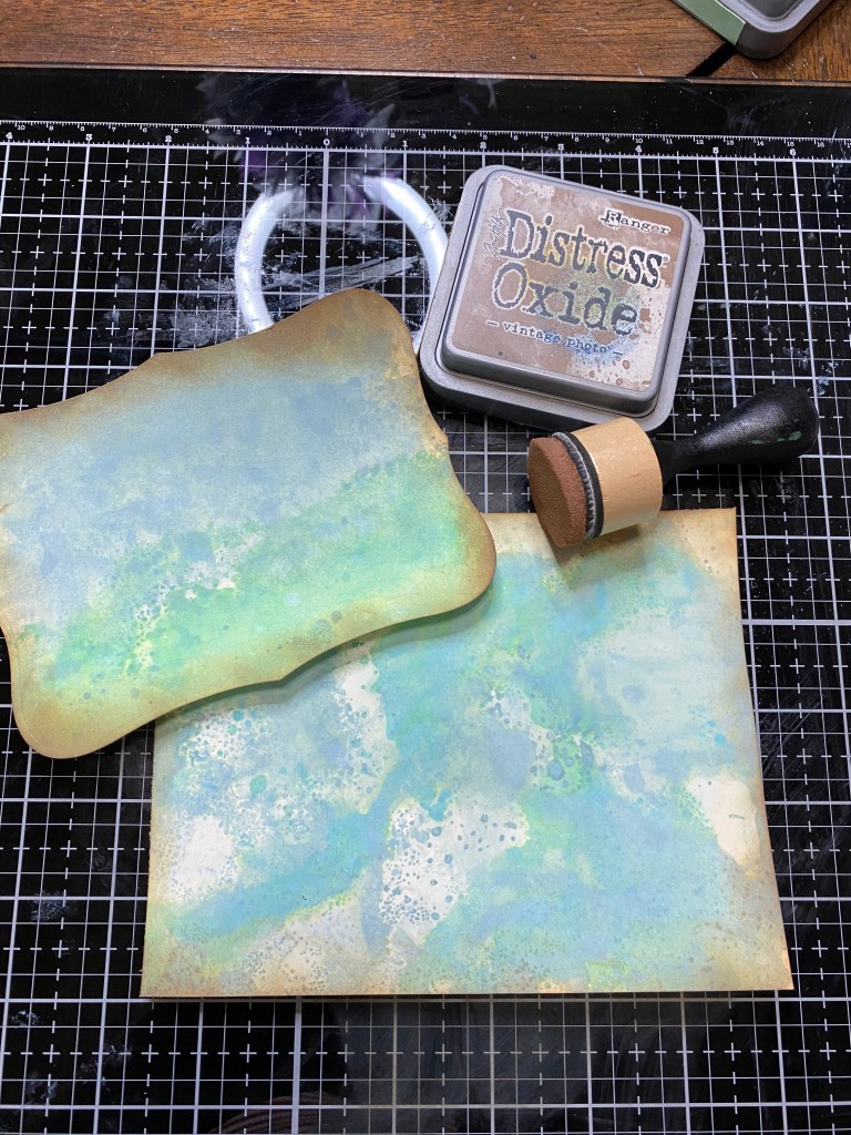 Once I was happy with my inky background, I used my original Distress Ink in Vintage Photo, to distress the edges of my paper. For this, I used a blending tool and blending foam. You just simply apply the ink in a circular motion, around the edges of your paper until it makes you happy.