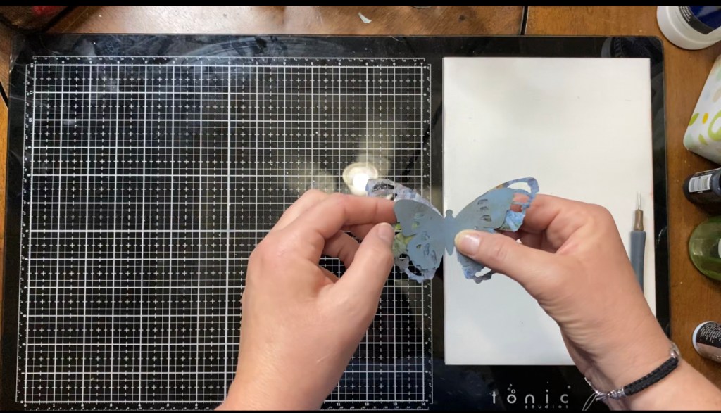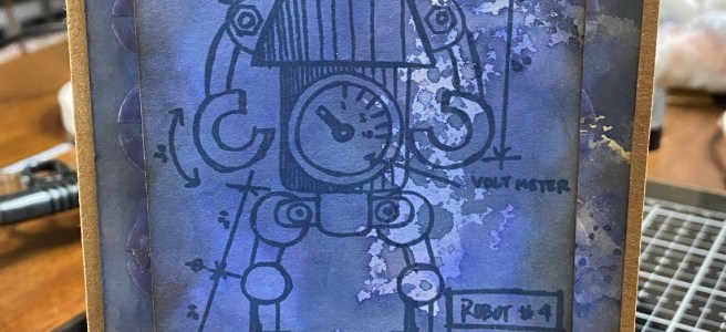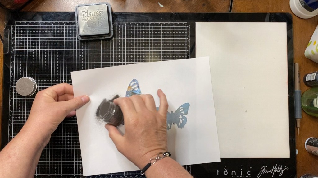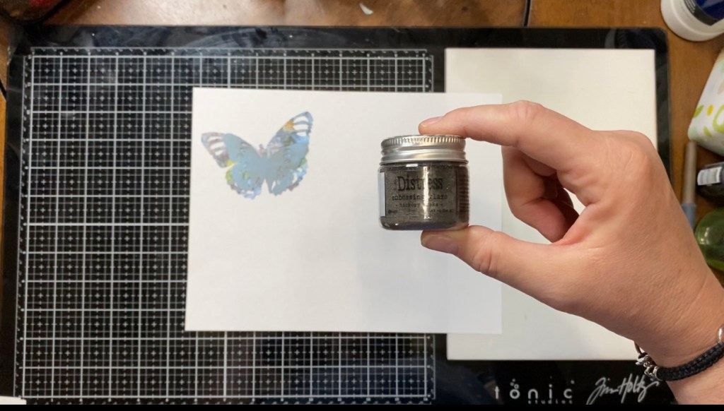 Anyway, this dragonfly, today, is liquid platinum. I just LOVE liquid platinum. It is beautiful when it’s heat embossed. For those of you that may not know, a quick tutorial on heat embossing. First, you stamp your image that you want to emboss with embossing ink. I used my Distress Embossing Ink, but there are others out there. Once you’ve stamped a good, clean image, you pour the embossing powder over the image and tap off the excess. I prefer to do this part over a coffee filter, or a piece of copy paper so that when I’m done, it can be poured back into the bottle. Then, using a heat embossing tool, you heat the powder until it melts. You end up with a beautiful, crisp image. Some embossing powders are shiny, and some can be dull. This particular powder is true to it’s name. It just looks liquid!!