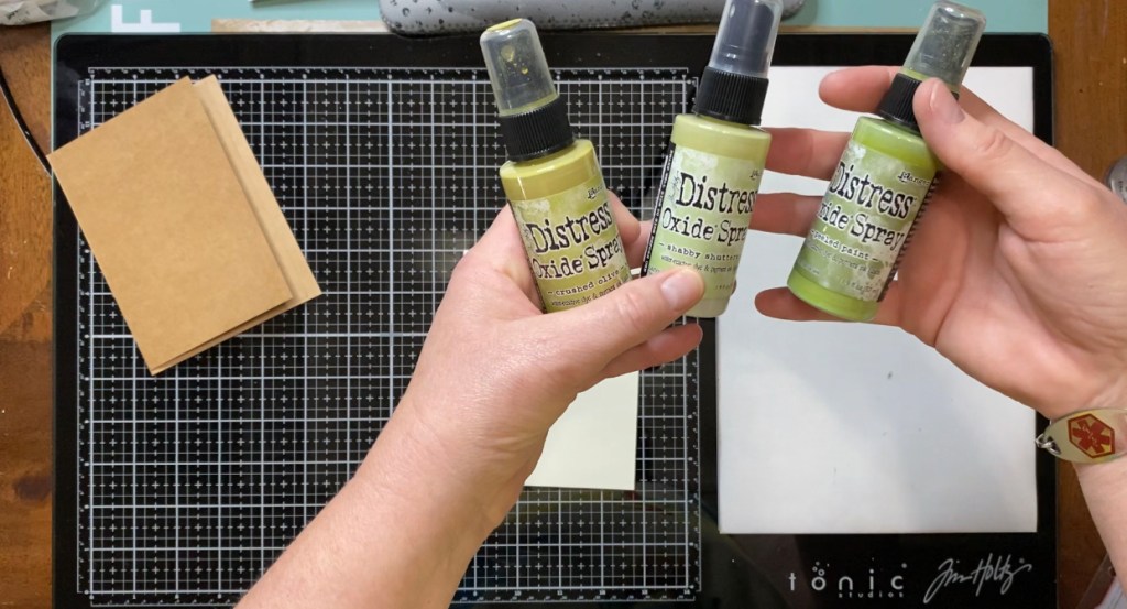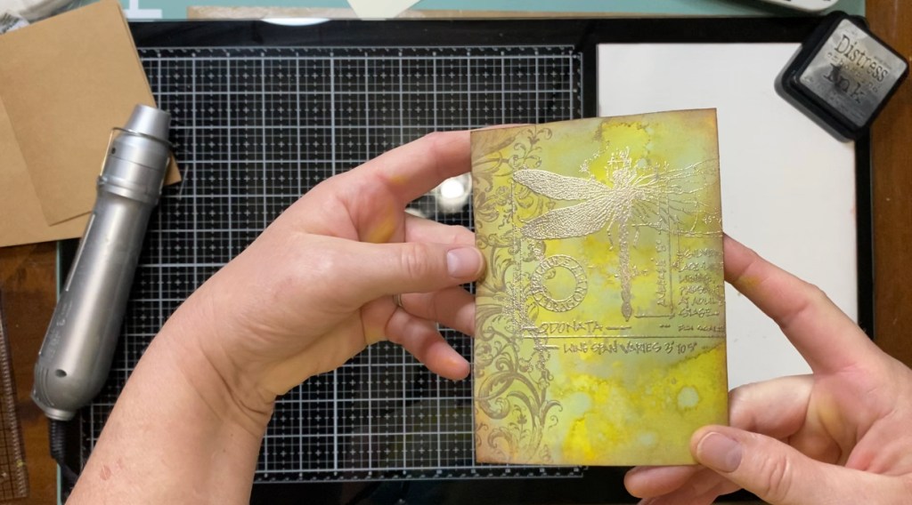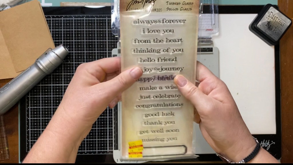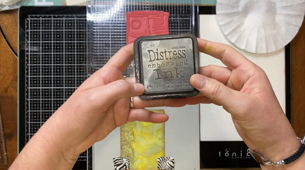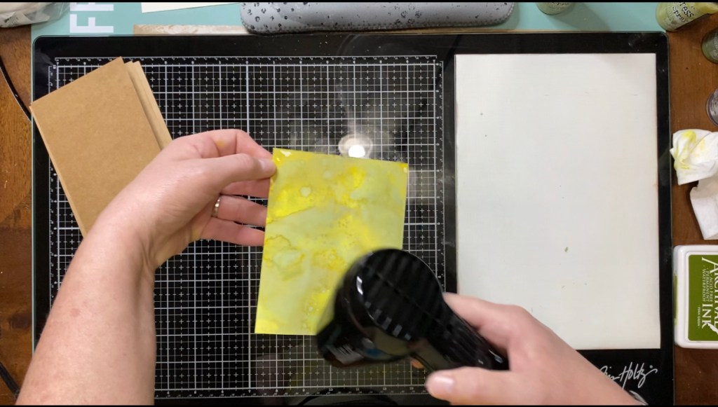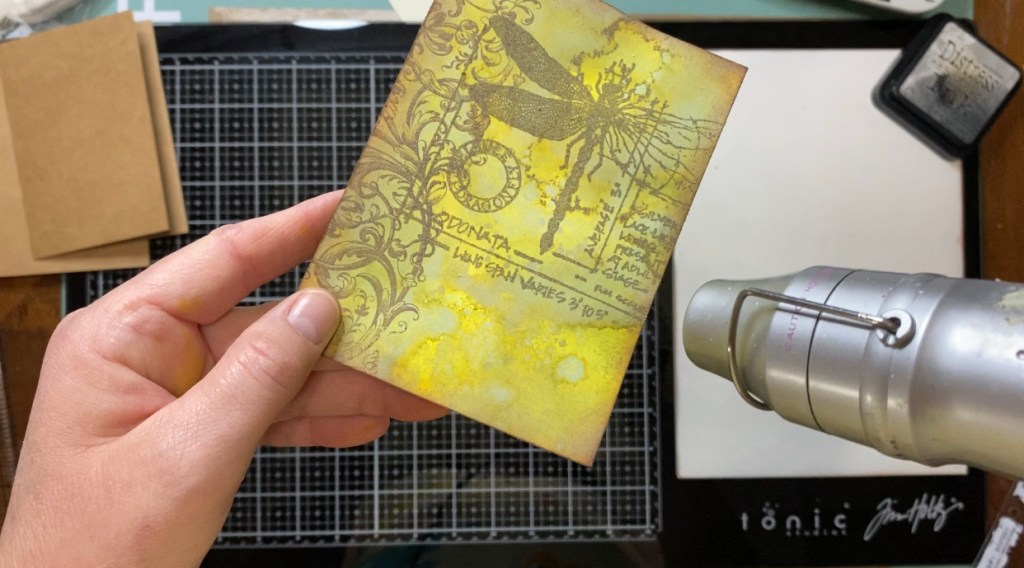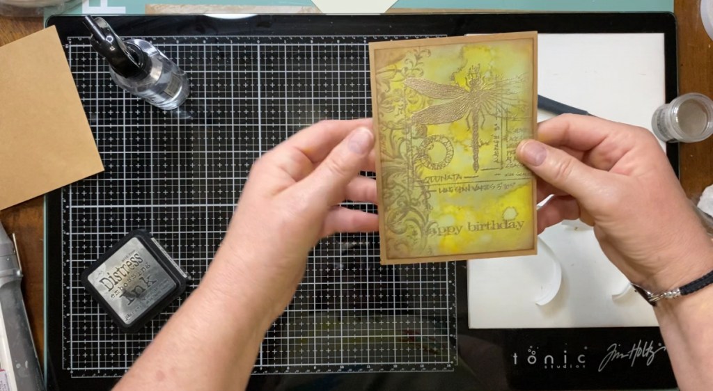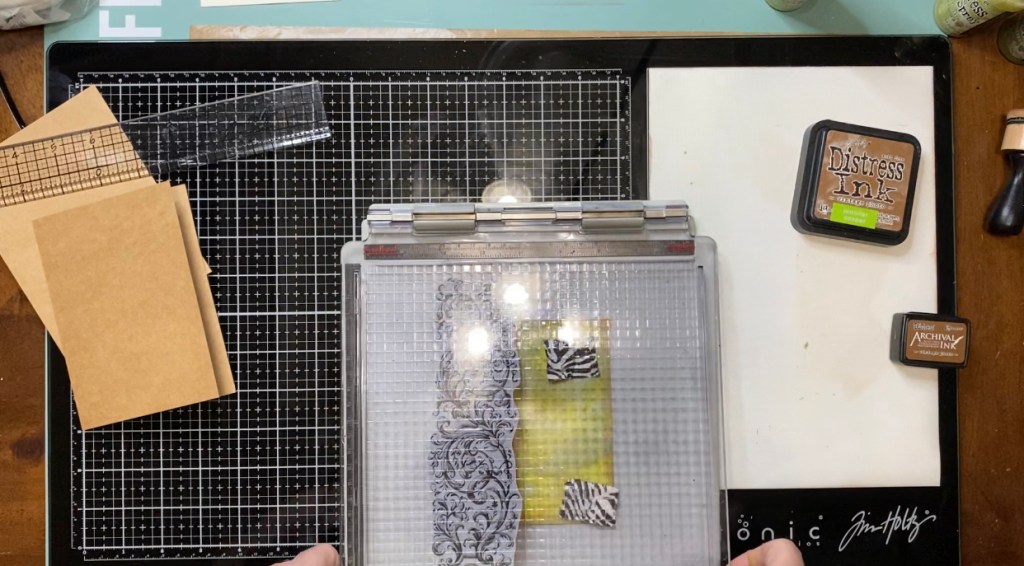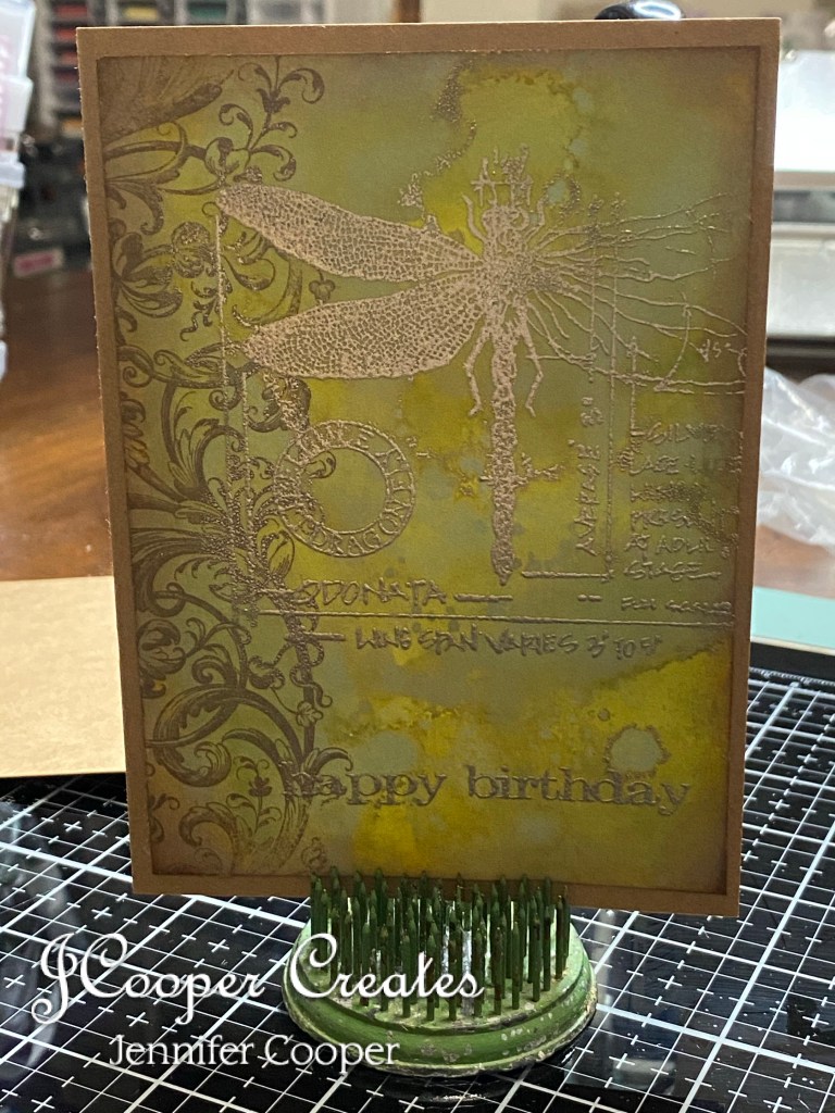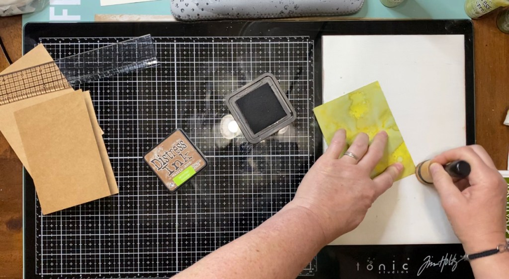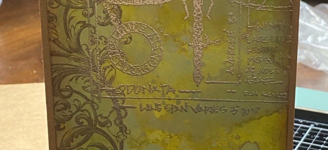 Last weeks YouTube Live demo from Tim Holtz was about Distress Inks so if you missed it, you may want to check it out. He demoed using the regular Distress Inks with the Distress Oxides. So, as you can see, that’s what i did. I used two pieces of Distress Mixed Media Heavystock cut to the width of the Etcetera tag. Then, by pressing the ink pad into my nonstick side of my media mat and spritzed it with some water droplets. I then dabbed the paper into the ink and water mix until I was happy with the coverage. As you can see, I used several shades of the blue and several shades of the green until I was happy. My aim was for the color of sky and grass. Once I was happy with my colors. I distressed the edges with a little Vintage Photo. I used the Stampers Anonymous Craze & Planks (CMS344) and stamped the craze image with Distress Ink “Broken China” for the blue and Distress Oxide “Mowed Lawn” for the green.