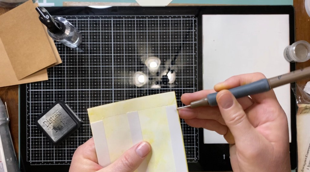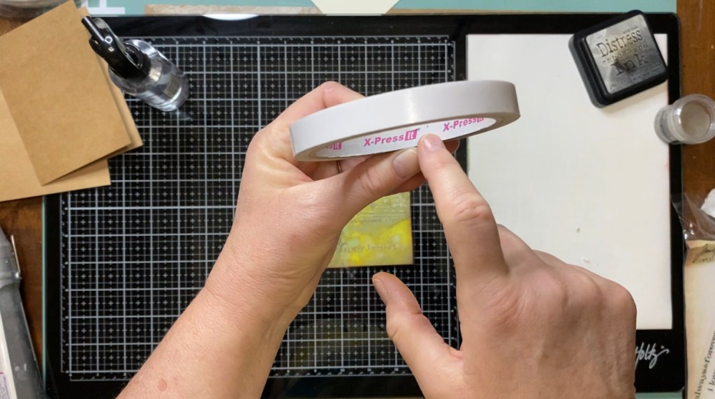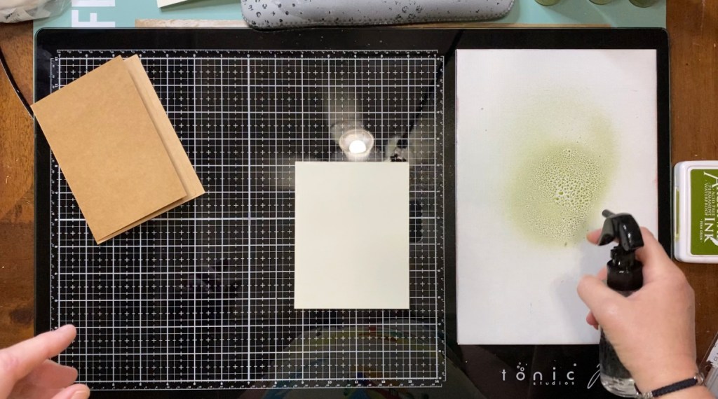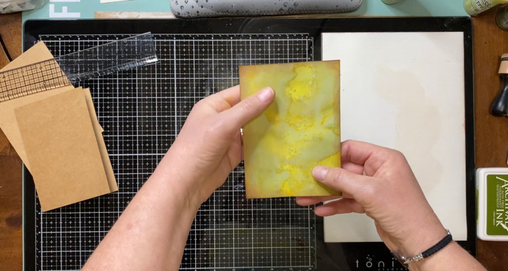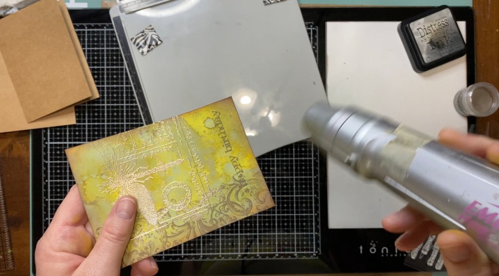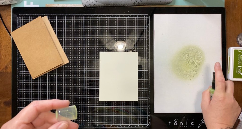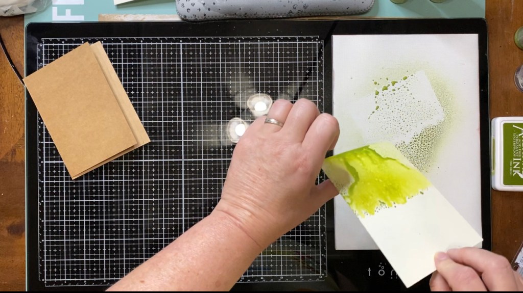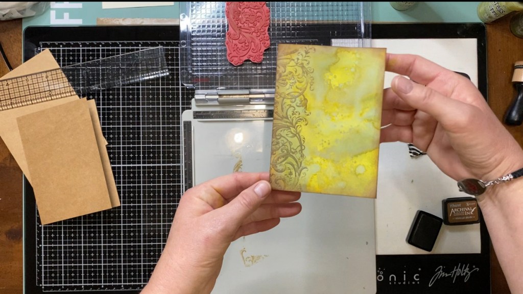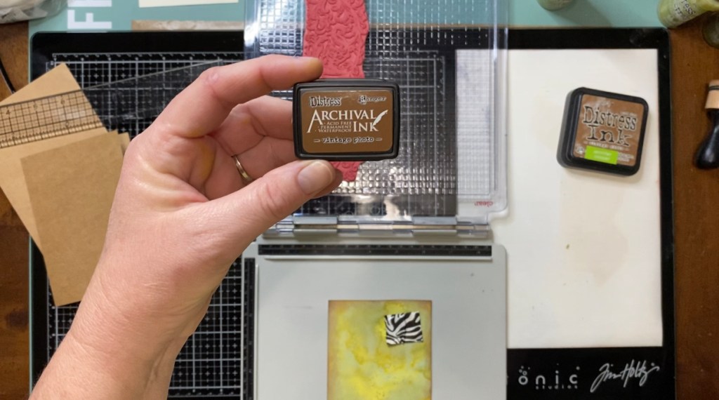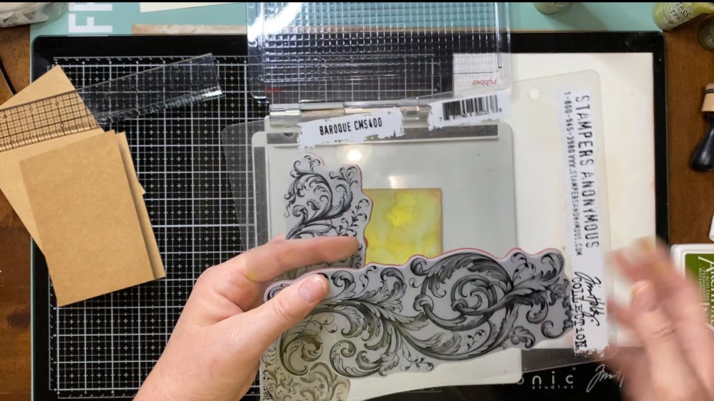 Last weeks YouTube Live demo from Tim Holtz was about Distress Inks so if you missed it, you may want to check it out. He demoed using the regular Distress Inks with the Distress Oxides. So, as you can see, that’s what i did. I used two pieces of Distress Mixed Media Heavystock cut to the width of the Etcetera tag. Then, by pressing the ink pad into my nonstick side of my media mat and spritzed it with some water droplets. I then dabbed the paper into the ink and water mix until I was happy with the coverage. As you can see, I used several shades of the blue and several shades of the green until I was happy. My aim was for the color of sky and grass. Once I was happy with my colors. I distressed the edges with a little Vintage Photo. I used the Stampers Anonymous Craze & Planks (CMS344) and stamped the craze image with Distress Ink “Broken China” for the blue and Distress Oxide “Mowed Lawn” for the green.